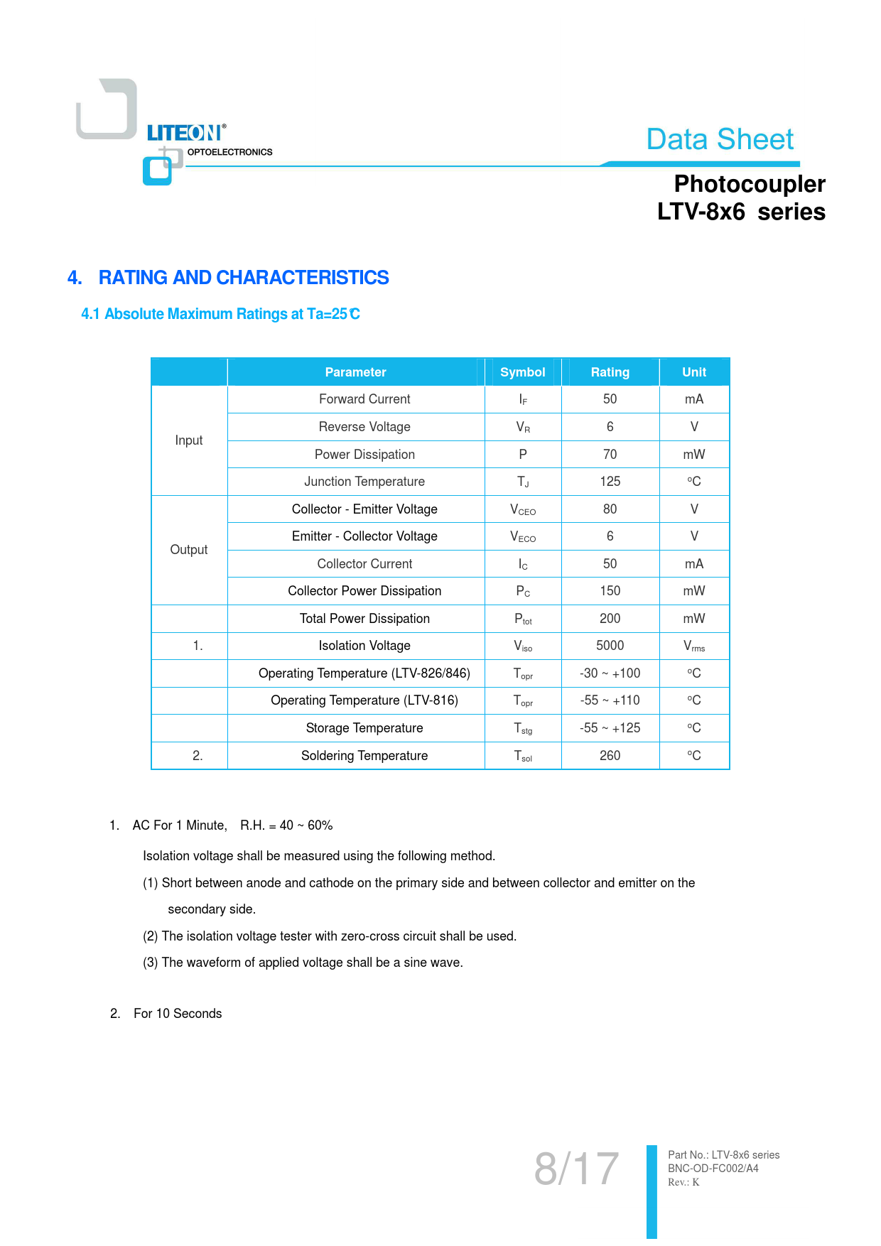 PhotocouplerLTV-8x6 series4. RATING AND CHARACTERISTICS4.1 Absolute Maximum Ratings at Ta=25°CParameterSymbolRatingUnit Forward Current IF 50 mA Reverse Voltage VR 6 V Input Power Dissipation P 70 mW Junction Temperature TJ 125 oC Collector - Emitter Voltage VCEO 80 V Emitter - Collector Voltage VECO 6 V Output Collector Current IC 50 mA Collector Power Dissipation PC 150 mW Total Power Dissipation Ptot 200 mW 1. Isolation Voltage Viso 5000 Vrms Operating Temperature (LTV-826/846) Topr -30 ~ +100 oC Operating Temperature (LTV-816) Topr -55 ~ +110 oC Storage Temperature Tstg -55 ~ +125 oC 2. Soldering Temperature Tsol 260 oC 1. AC For 1 Minute, R.H. = 40 ~ 60% Isolation voltage shall be measured using the following method. (1) Short between anode and cathode on the primary side and between collector and emitter on the secondary side. (2) The isolation voltage tester with zero-cross circuit shall be used. (3) The waveform of applied voltage shall be a sine wave. 2. For 10 Seconds 8/17 Part No.: LTV -8x6 serie s BNC-OD-FC002/A4 Rev.: K