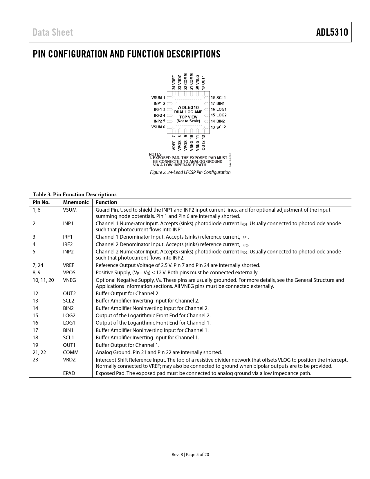 link to page 11 link to page 13 Data SheetADL5310PIN CONFIGURATION AND FUNCTION DESCRIPTIONSMMFZG1EDMMETRROONUVVCCVO432102222921VSUM 118 SCL1INP1 217 BIN1ADL5310IRF1 316 LOG1DUAL LOG AMPIRF2 415 LOG2TOP VIEWINP2 5(Not to Scale)14 BIN2VSUM 613 SCL278901 11 21FSSGG2EOOEETRPPNNUVVVVVO 2 NOTES 00 1. EXPOSED PAD. THE EXPOSED PAD MUST -0- BE CONNECTED TO ANALOG GROUND 415 VIA A LOW IMPEDANCE PATH. 04 Figure 2. 24-Lead LFCSP Pin Configuration Table 3. Pin Function Descriptions Pin No.MnemonicFunction 1, 6 VSUM Guard Pin. Used to shield the INP1 and INP2 input current lines, and for optional adjustment of the input summing node potentials. Pin 1 and Pin 6 are internally shorted. 2 INP1 Channel 1 Numerator Input. Accepts (sinks) photodiode current IPD1. Usually connected to photodiode anode such that photocurrent flows into INP1. 3 IRF1 Channel 1 Denominator Input. Accepts (sinks) reference current, IRF1. 4 IRF2 Channel 2 Denominator Input. Accepts (sinks) reference current, IRF2. 5 INP2 Channel 2 Numerator Input. Accepts (sinks) photodiode current IPD2. Usually connected to photodiode anode such that photocurrent flows into INP2. 7, 24 VREF Reference Output Voltage of 2.5 V. Pin 7 and Pin 24 are internally shorted. 8, 9 VPOS Positive Supply, (VP – VN) ≤ 12 V. Both pins must be connected externally. 10, 11, 20 VNEG Optional Negative Supply, VN. These pins are usually grounded. For more details, see the General Structure and Applications Information sections. All VNEG pins must be connected externally. 12 OUT2 Buffer Output for Channel 2. 13 SCL2 Buffer Amplifier Inverting Input for Channel 2. 14 BIN2 Buffer Amplifier Noninverting Input for Channel 2. 15 LOG2 Output of the Logarithmic Front End for Channel 2. 16 LOG1 Output of the Logarithmic Front End for Channel 1. 17 BIN1 Buffer Amplifier Noninverting Input for Channel 1. 18 SCL1 Buffer Amplifier Inverting Input for Channel 1. 19 OUT1 Buffer Output for Channel 1. 21, 22 COMM Analog Ground. Pin 21 and Pin 22 are internally shorted. 23 VRDZ Intercept Shift Reference Input. The top of a resistive divider network that offsets VLOG to position the intercept. Normally connected to VREF; may also be connected to ground when bipolar outputs are to be provided. EPAD Exposed Pad. The exposed pad must be connected to analog ground via a low impedance path. Rev. B | Page 5 of 20 Document Outline FEATURES APPLICATIONS FUNCTIONAL BLOCK DIAGRAM GENERAL DESCRIPTION TABLE OF CONTENTS REVISION HISTORY SPECIFICATIONS ABSOLUTE MAXIMUM RATINGS ESD CAUTION PIN CONFIGURATION AND FUNCTION DESCRIPTIONS TYPICAL PERFORMANCE CHARACTERISTICS GENERAL STRUCTURE THEORY MANAGING INTERCEPT AND SLOPE RESPONSE TIME AND NOISE CONSIDERATIONS APPLICATIONS INFORMATION CALIBRATION MINIMIZING CROSSTALK RELATIVE AND ABSOLUTE POWER MEASUREMENTS CHARACTERIZATION METHODS EVALUATION BOARD OUTLINE DIMENSIONS ORDERING GUIDE