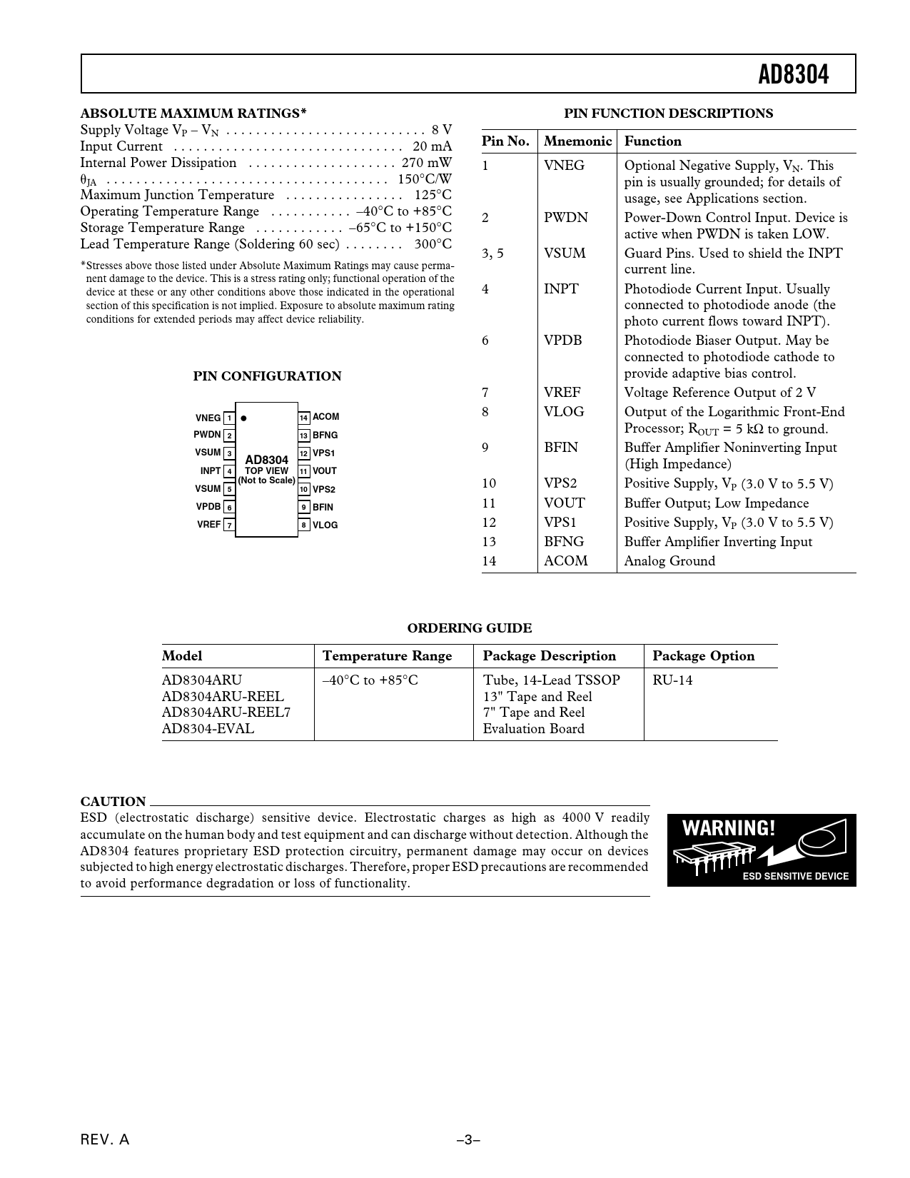 页数 / 页20 / 3 — AD8304. ABSOLUTE MAXIMUM RATINGS*. PIN FUNCTION DESCRIPTIONS. Pin No. …