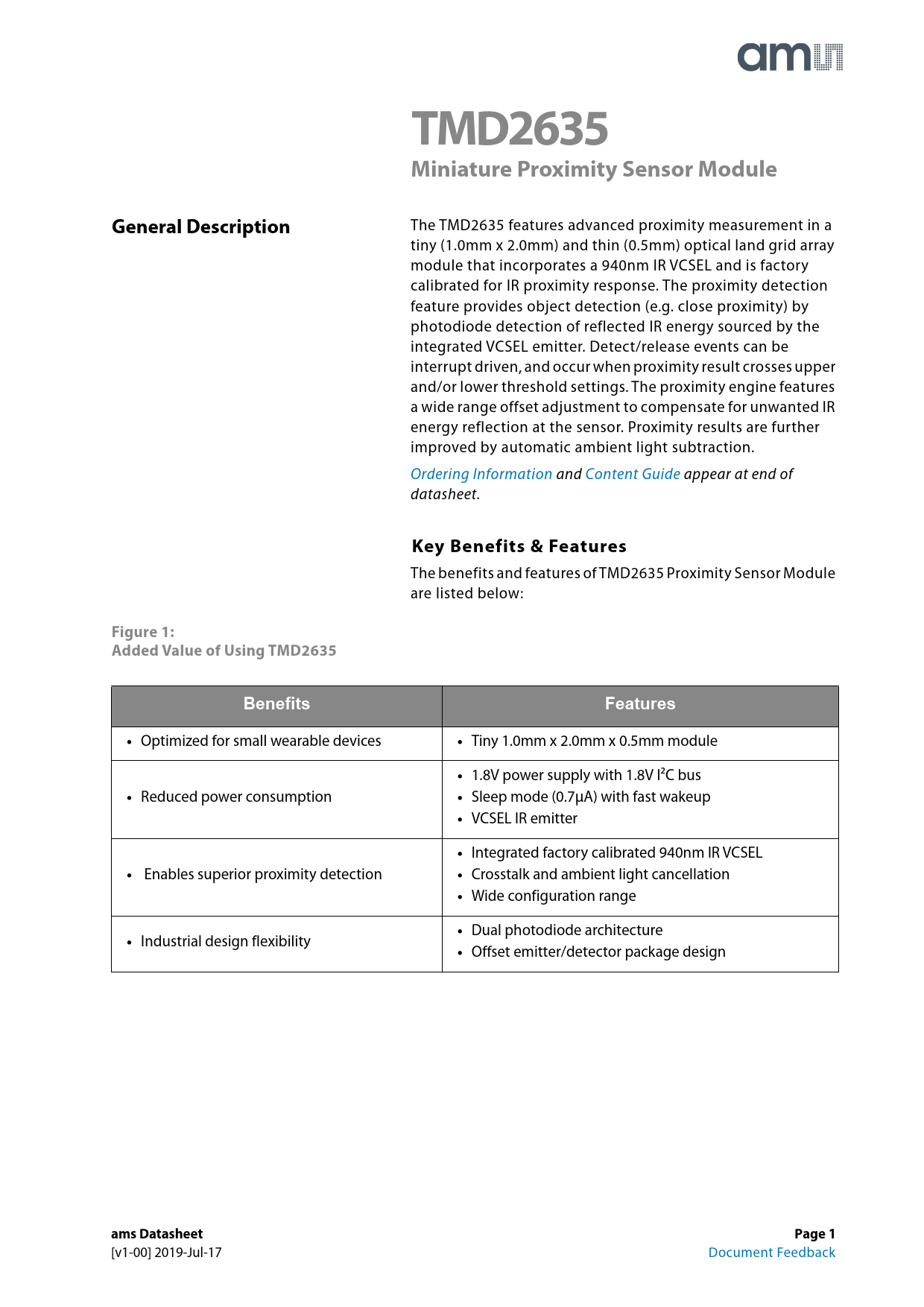 页数 / 页47 / 1 — TMD2635. Miniature Proximity Sensor Module. General Description. Key …