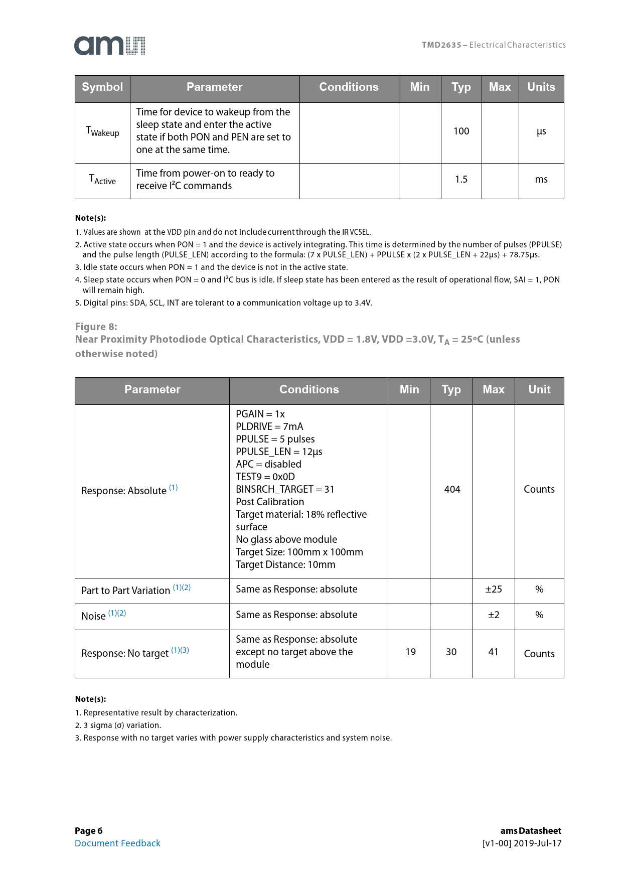 link to page 6 link to page 6 link to page 6 link to page 6 link to page 6 link to page 6 link to page 6 TMD2635 − Electrical Characteristics SymbolParameterConditionsMinTypMaxUnits Time for device to wakeup from the sleep state and enter the active TWakeup 100 μs state if both PON and PEN are set to one at the same time. Time from power-on to ready to TActive 1.5 ms receive I²C commands Note(s): 1. Values are shown at the VDD pin and do not include current through the IR VCSEL. 2. Active state occurs when PON = 1 and the device is actively integrating. This time is determined by the number of pulses (PPULSE) and the pulse length (PULSE_LEN) according to the formula: (7 x PULSE_LEN) + PPULSE x (2 x PULSE_LEN + 22μs) + 78.75μs. 3. Idle state occurs when PON = 1 and the device is not in the active state. 4. Sleep state occurs when PON = 0 and I²C bus is idle. If sleep state has been entered as the result of operational flow, SAI = 1, PON will remain high. 5. Digital pins: SDA, SCL, INT are tolerant to a communication voltage up to 3.4V. Figure 8: Near Proximity Photodiode Optical Characteristics, VDD = 1.8V, VDD =3.0V, TA = 25ºC (unless otherwise noted)ParameterConditionsMinTypMaxUnit PGAIN = 1x PLDRIVE = 7mA PPULSE = 5 pulses PPULSE_LEN = 12μs APC = disabled TEST9 = 0x0D Response: Absolute (1) BINSRCH_TARGET = 31 404 Counts Post Calibration Target material: 18% reflective surface No glass above module Target Size: 100mm x 100mm Target Distance: 10mm Part to Part Variation (1)(2) Same as Response: absolute ±25 % Noise (1)(2) Same as Response: absolute ±2 % Same as Response: absolute Response: No target (1)(3) except no target above the 19 30 41 Counts module Note(s): 1. Representative result by characterization. 2. 3 sigma (σ) variation. 3. Response with no target varies with power supply characteristics and system noise. Page 6ams Datasheet Document Feedback [v1-00] 2019-Jul-17 Document Outline General Description Key Benefits & Features Applications Block Diagram Pin Assignment Absolute Maximum Ratings Electrical Characteristics Timing Characteristics Detailed Description Proximity Operation Proximity I²C Characteristics Alternate I²C Address Option I²C Write Transaction I²C Read Transaction Simplified State Diagram Register Description ENABLE Register (0x80) PRATE Register (0x82) PILTL Register (0x88) PILTH Register (0x89) PIHTL Register (0x8A) PIHTH Register (0x8B) PERS Register (0x8C) CFG0 Register (0x8D) PCFG0 Register (0x8E) PCFG1 Register (0x8F) REVID Register (0x91) ID Register (0x92) STATUS Register (0x9B) PDATAL Register (0x9C) PDATAH Register (0x9D) REVID2 Register (0xA6) SOFTRST Register (0xA8) PWTIME Register (0xA9) CFG8 Register (0xAA) CFG3 Register (0xAB) CFG6 Register (0xAE) PFILTER Register (0xB3) POFFSETL Register (0xC0) POFFSETH Register (0xC1) CALIB Register (0xD7) CALIBCFG Register (0xD9) CALIBSTAT Register (0xDC) INTENAB Register (0xDD) FAC_L Register (0xE5) FAC_H Register (0xE6) TEST9 Register (0xF9) Application Information PCB Pad Layout Packaging Drawings Tape & Reel Information Soldering & Storage Information Storage Information Moisture Sensitivity Shelf Life Floor Life Rebaking Instructions Laser Eye Safety Ordering & Contact Information RoHS Compliant & ams Green Statement Copyrights & Disclaimer Document Status Revision Information Content Guide