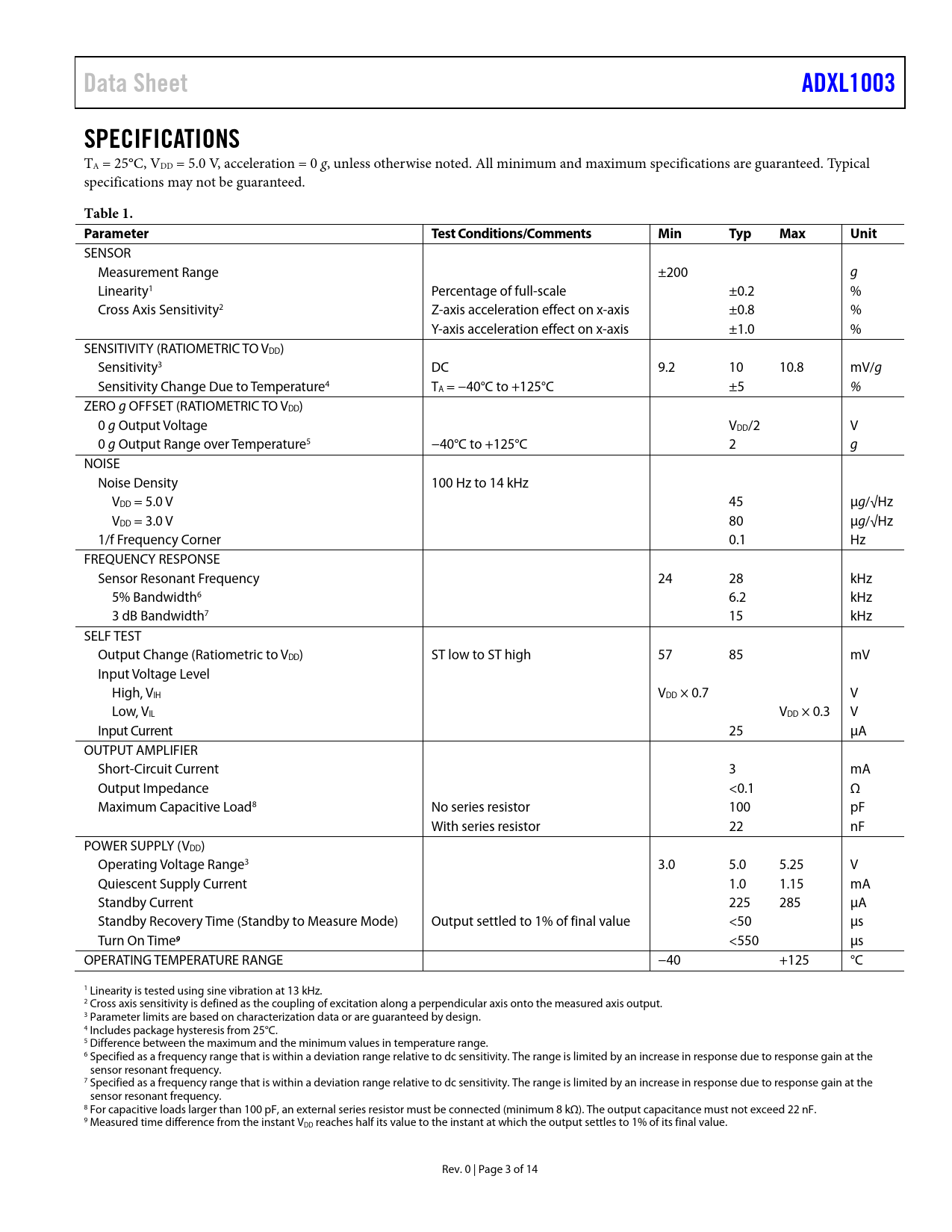 页数 / 页14 / 3 — Data Sheet. ADXL1003. SPECIFICATIONS. Table 1. Parameter Test. …