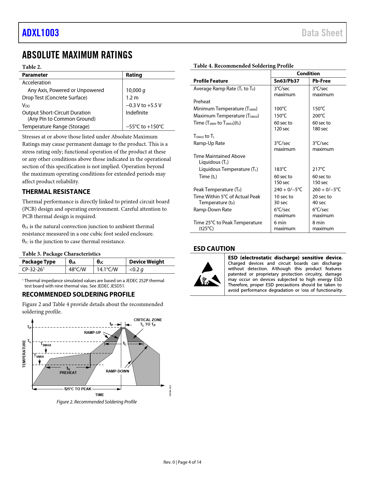 ADXL1003 Data Sheet ABSOLUTE MAXIMUM RATINGS Table 2 Table 4 Recommended Soldering Profile Parameter Rating Condition