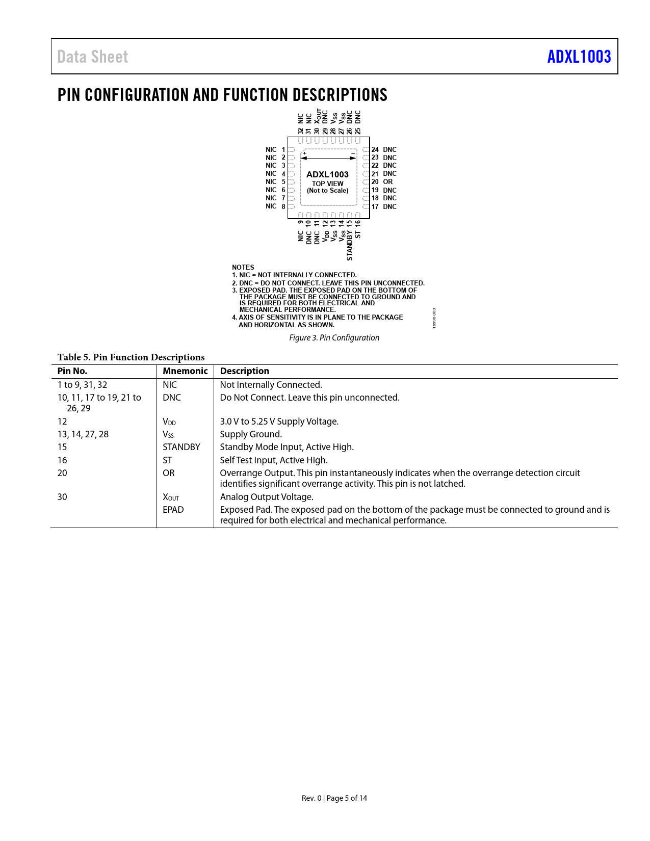 页数 / 页14 / 5 — Data Sheet. ADXL1003. PIN CONFIGURATION AND FUNCTION DESCRIPTIONS. NIC 1. …