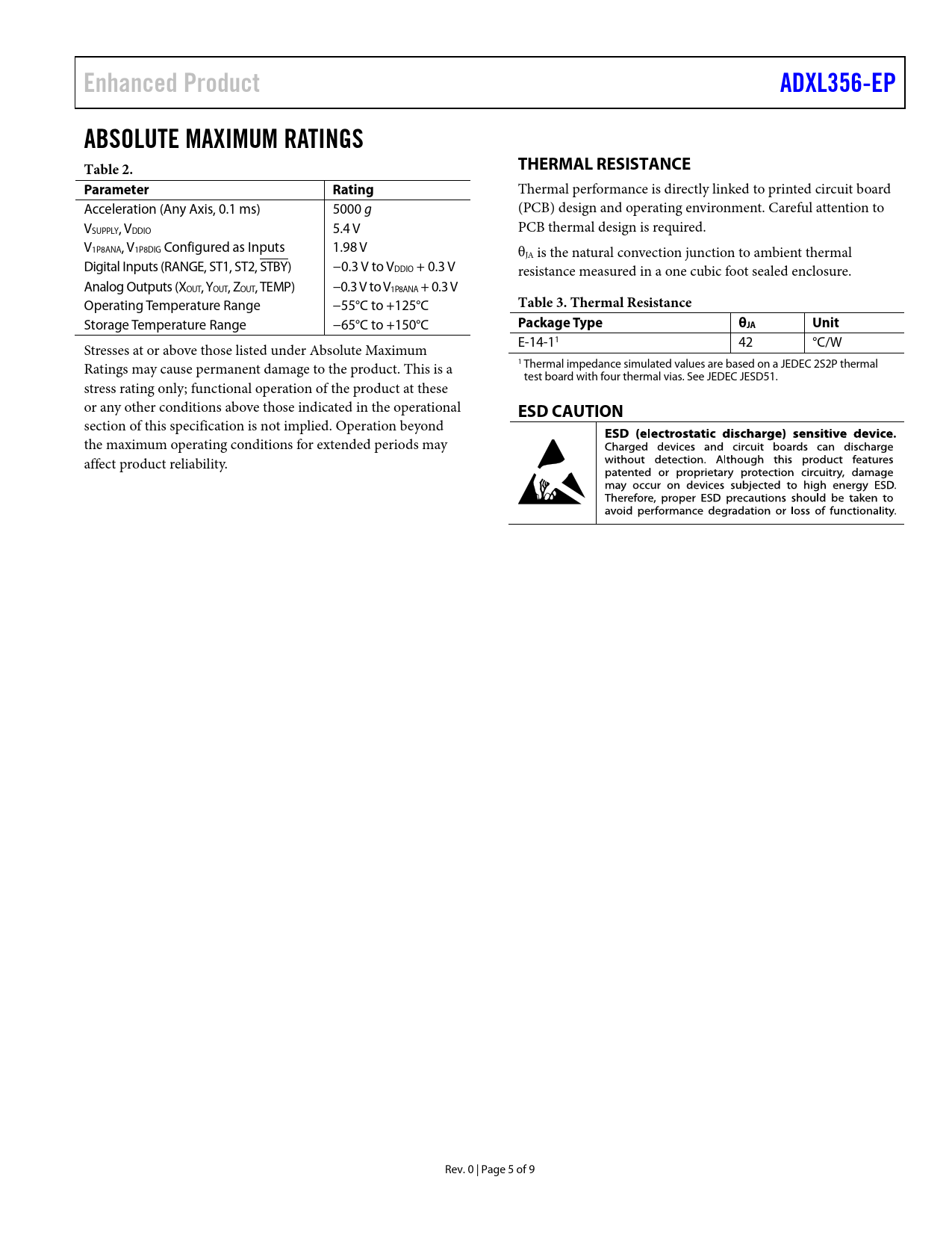 Enhanced Product ADXL356-EP ABSOLUTE MAXIMUM RATINGS Table 2. THERMAL RESISTANCE Parameter Rating