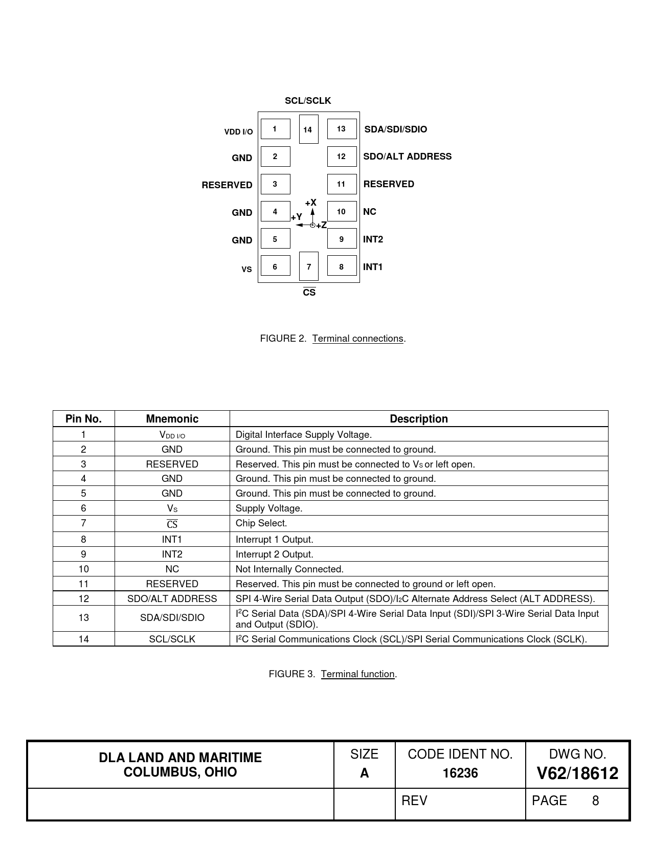 SCL/SCLKVDD I/O11413SDA/SDI/SDIOGND212SDO/ALT ADDRESSRESERVED311RESERVED+XGND410NC+Y+ZGND59INT2VS678INT1CS FIGURE 2. Terminal connections. Pin No.MnemonicDescription 1 VDD I/O Digital Interface Supply Voltage. 2 GND Ground. This pin must be connected to ground. 3 RESERVED Reserved. This pin must be connected to VS or left open. 4 GND Ground. This pin must be connected to ground. 5 GND Ground. This pin must be connected to ground. 6 VS Supply Voltage. 7 C�S �� Chip Select. 8 INT1 Interrupt 1 Output. 9 INT2 Interrupt 2 Output. 10 NC Not Internally Connected. 11 RESERVED Reserved. This pin must be connected to ground or left open. 12 SDO/ALT ADDRESS SPI 4-Wire Serial Data Output (SDO)/I2C Alternate Address Select (ALT ADDRESS). 13 SDA/SDI/SDIO I2C Serial Data (SDA)/SPI 4-Wire Serial Data Input (SDI)/SPI 3-Wire Serial Data Input and Output (SDIO). 14 SCL/SCLK I2C Serial Communications Clock (SCL)/SPI Serial Communications Clock (SCLK). FIGURE 3. Terminal function. DLA LAND AND MARITIME SIZE CODE IDENT NO. DWG NO. COLUMBUS, OHIOA16236V62/18612 REV PAGE 8 Document Outline DESCRIPTION REV REV PMIC N/A TITLE SIZE A V62/18612 REV