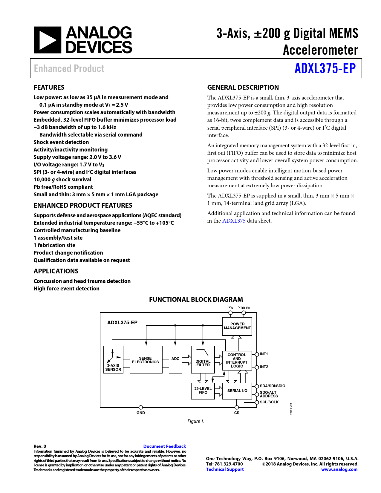 Controlled manufacturing baseline 1 assembly/test site 1 fabrication site Product change notification Qualification data available on request APPLICATIONS Concussion and head trauma detection High force event detection FUNCTIONAL BLOCK DIAGRAM VS VDD I/O ADXL375-EP POWER MANAGEMENT CONTROL INT1 SENSE ADC AND ELECTRONICS DIGITAL INTERRUPT 3-AXIS FILTER LOGIC INT2 SENSOR SDA/SDI/SDIO 32-LEVEL SERIAL I/O FIFO SDO/ALT ADDRESS SCL/SCLK