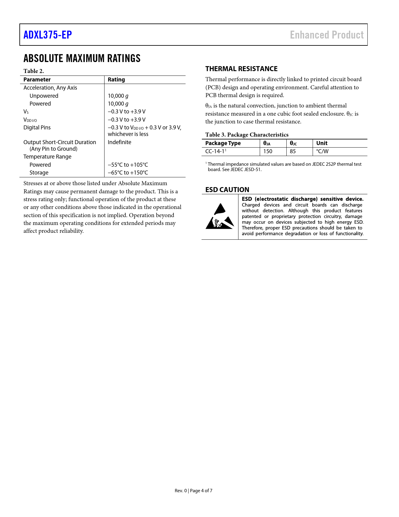 ADXL375-EP. Enhanced Product. ABSOLUTE MAXIMUM RATINGS Table 2. THERMAL RESISTANCE. Parameter. Rating
