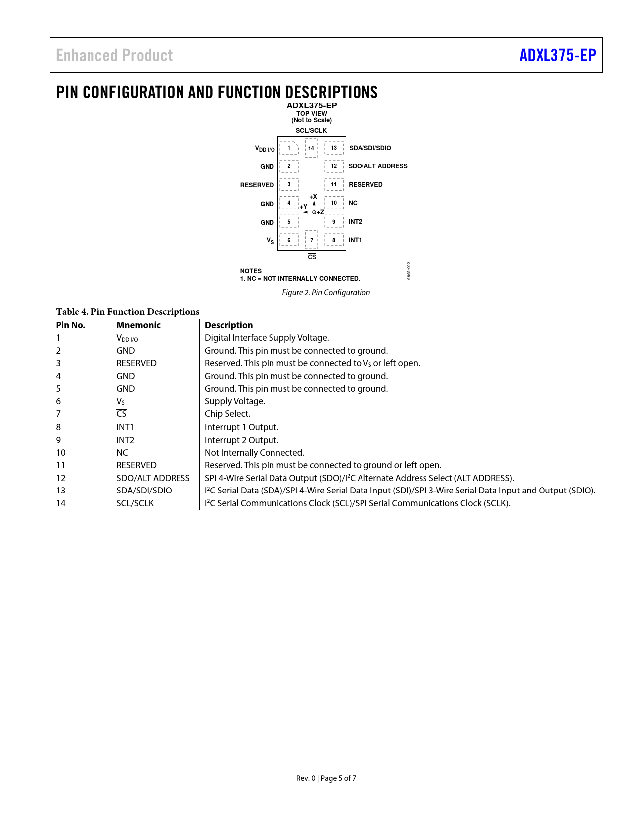 页数 / 页7 / 5 — Enhanced Product. ADXL375-EP. PIN CONFIGURATION AND FUNCTION …
