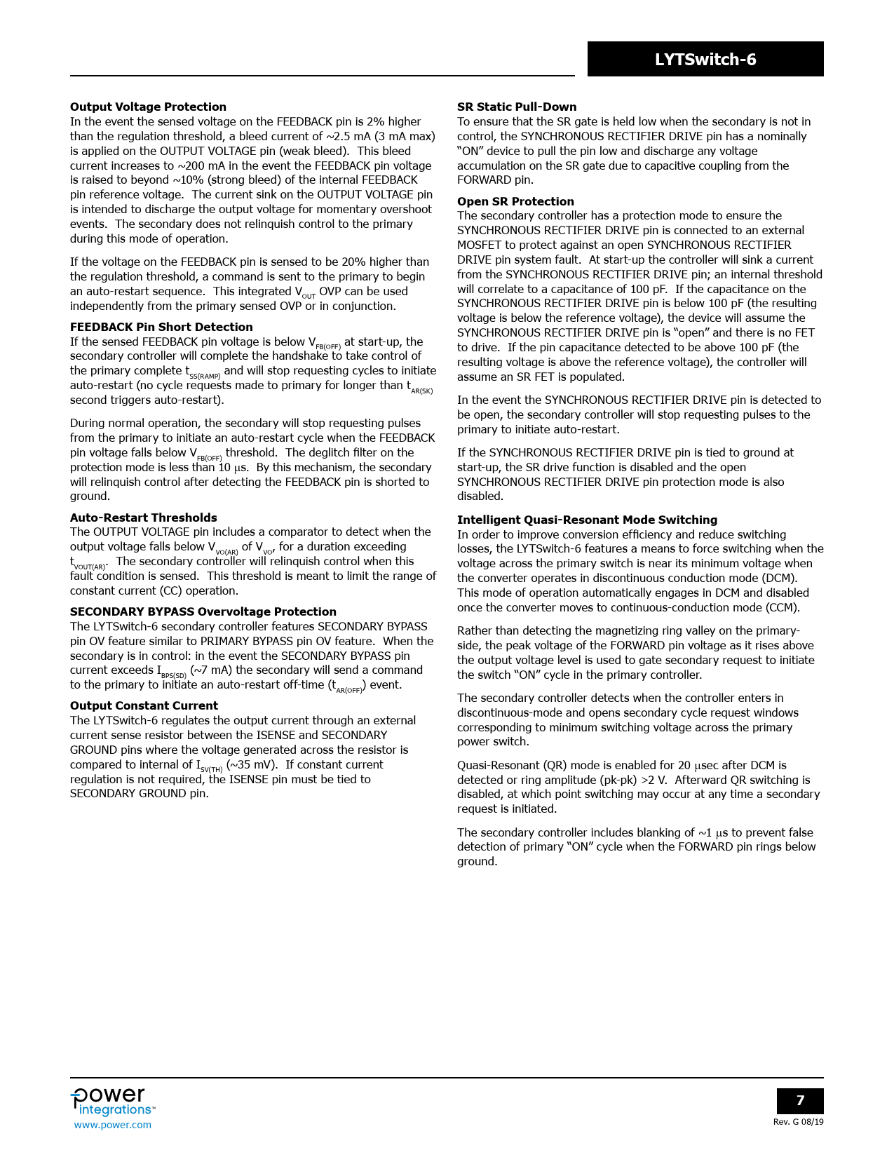 页数 / 页36 / 7 — LYTSwitch-6. Output Voltage Protection. SR Static Pull-Down. Open SR …