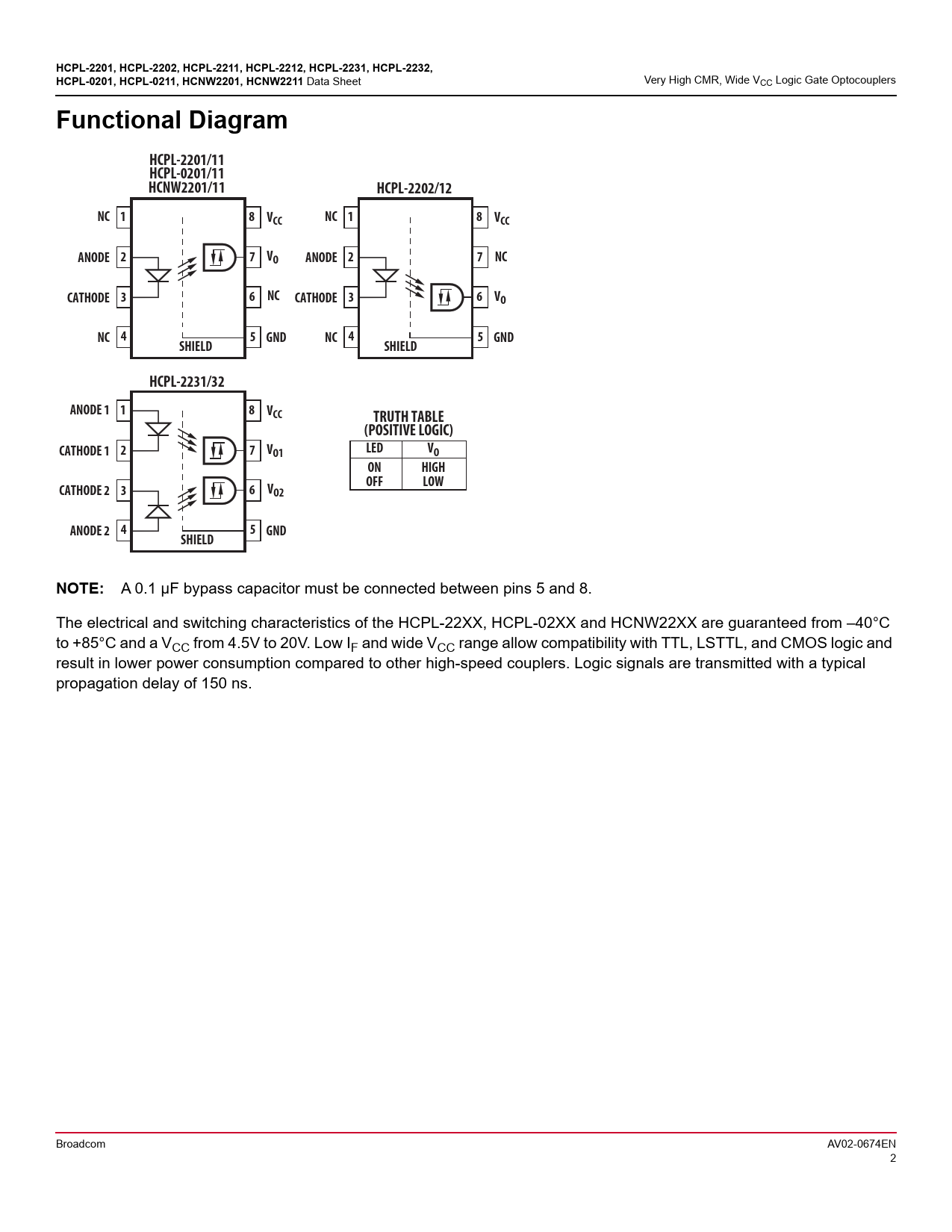 HCPL-2201, HCPL-2202, HCPL-2211, HCPL-2212, HCPL-2231, HCPL-2232, HCPL-0201, HCPL-0211, HCNW2201, HCNW2211 Data Sheet Very High CMR, Wide VCC Logic Gate Optocouplers Functional DiagramHCPL-2201/11HCPL-0201/11HCNW2201/11HCPL-2202/12NC 18 VCCNC 18 VCCANODE 27 VOANODE 27 NCCATHODE 36 NC CATHODE 36 VONC 45 GNDNC 45 GNDSHIELDSHIELDHCPL-2231/32ANODE 1 18 VCCTRUTH TABLE(POSITIVE LOGIC)CATHODE 1 27 VO1LEDVOONHIGHOFFLOWCATHODE 2 36 VO2ANODE 2 45 GNDSHIELDNOTE: A 0.1 µF bypass capacitor must be connected between pins 5 and 8. The electrical and switching characteristics of the HCPL-22XX, HCPL-02XX and HCNW22XX are guaranteed from –40°C to +85°C and a VCC from 4.5V to 20V. Low IF and wide VCC range allow compatibility with TTL, LSTTL, and CMOS logic and result in lower power consumption compared to other high-speed couplers. Logic signals are transmitted with a typical propagation delay of 150 ns. Broadcom AV02-0674EN 2 Document Outline Description Features Applications Functional Diagram Selection Guide Schematic Ordering Information Package Outline Drawings 8-Pin DIP Package (HCPL-2201/02/11/12/31/32) 8-Pin DIP Package with Gull Wing Surface Mount Option 300 (HCPL-2201/02/11/12/31/32) Small-Outline SO-8 Package (HCPL-0201/11) 8-Pin Widebody DIP Package (HCNW2201/11) 8-Pin Widebody DIP Package with Gull Wing Surface Mount Option 300 (HCNW2201/11) Solder Reflow Profile Regulatory Information Insulation and Safety Related Specifications IEC/EN/DIN EN 60747-5-5 Insulation Characteristics (Option 060) IEC/EN/DIN EN 60747-5-5 Insulation Characteristics (HCNW22xx Option 060 ONLY) Absolute Maximum Ratings Recommended Operating Conditions Electrical Specifications Switching Specifications (AC) Package Characteristics