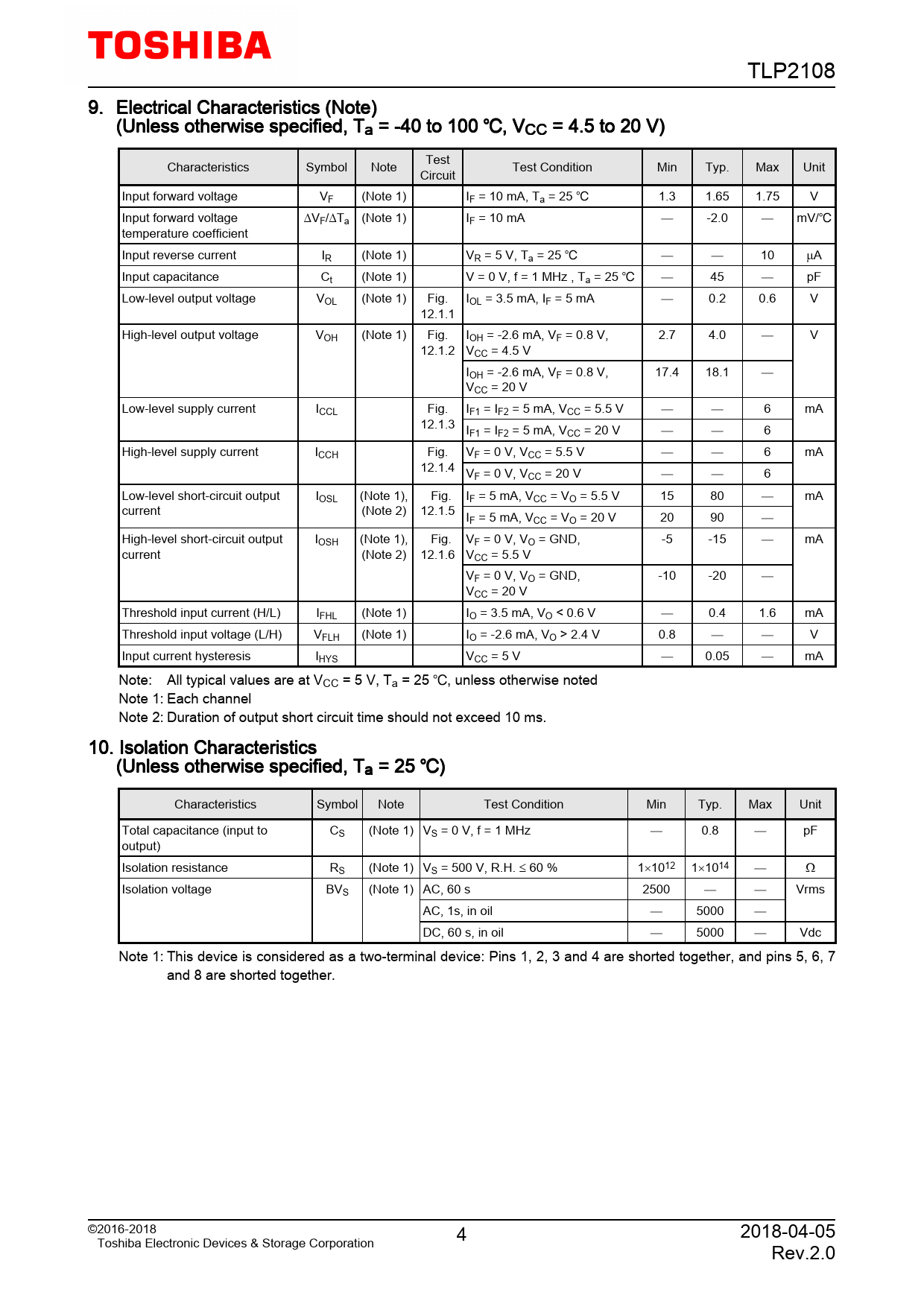 TLP2108. 9. Electrical. Characteristics. (Note). (Unless. otherwise. specified,. Ta. =. -40. to. 100. ,. VCC. =. 4.5. to. 20. V). Test. Characteristics. Symbol. Note