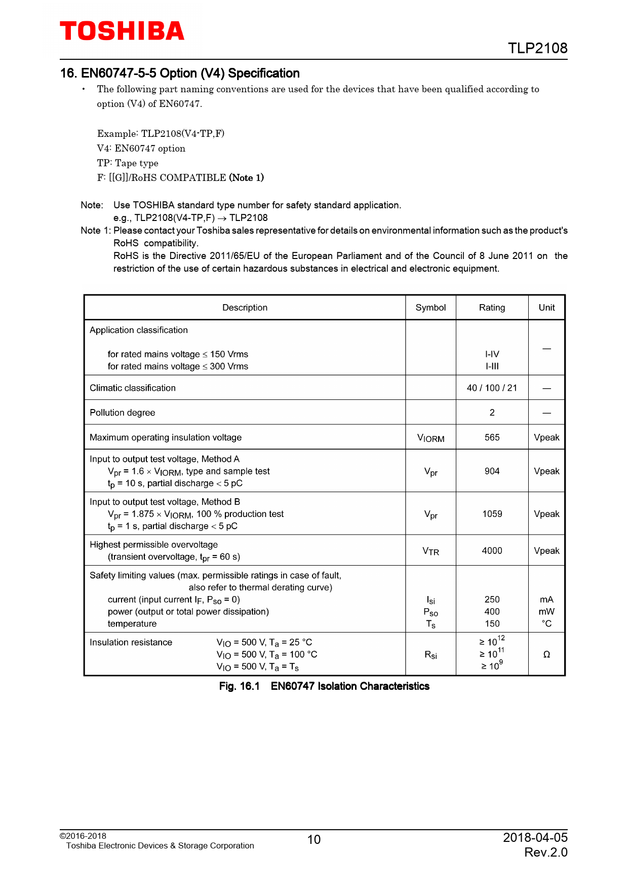 TLP2108 16. EN60747-5-5 Option (V4) Specification • The following part naming conventions are used for the devices that have been qualified according to option (V4) of EN60747. Example: TLP2108(V4-TP,F) V4: EN60747 option TP: Tape type F: [[G]]/RoHS COMPATIBLE (Note 1) Note: Use TOSHIBA standard type number for safety standard application. e.g., TLP2108(V4-TP,F) → TLP2108 Note 1: Please contact your Toshiba sales representative for details on environmental information such as the product's RoHS compatibility. RoHS is the Directive 2011/65/EU of the European Parliament and of the Council of 8 June 2011 on the restriction of the use of certain hazardous substances in electrical and electronic equipment. Fig. 16.1 EN60747 Isolation Characteristics ©2016-2018 10 2018-04-05 Toshiba Electronic Devices & Storage Corporation Rev.2.0