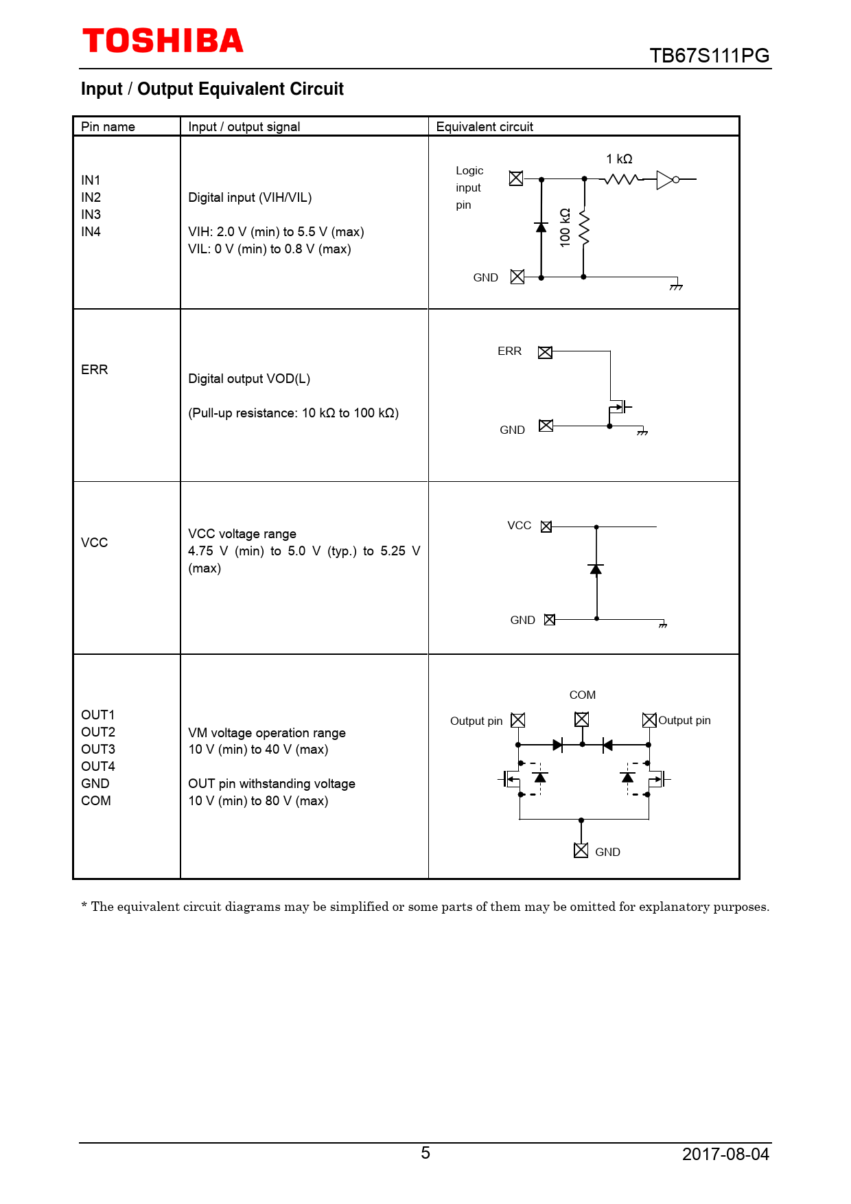 TB67S111PG Input / Output Equivalent Circuit Pin name Input / output signal Equivalent circuit 1 kΩ Logic IN1 input IN2 Digital input (VIH/VIL) pin IN3 IN4 VIH: 2.0 V (min) to 5.5 V (max) 0 kΩ VIL: 0 V (min) to 0.8 V (max) 10 GND ERR ERR Digital output VOD(L) (Pul -up resistance: 10 kΩ to 100 kΩ) GND VCC voltage range VCC VCC 4.75 V (min) to 5.0 V (typ.) to 5.25 V (max) GND COM OUT1 Output pin Output pin OUT2 VM voltage operation range OUT3 10 V (min) to 40 V (max) OUT4 GND OUT pin withstanding voltage COM 10 V (min) to 80 V (max) GND * The equivalent circuit diagrams may be simplified or some parts of them may be omitted for explanatory purposes. 5 2017-08-04