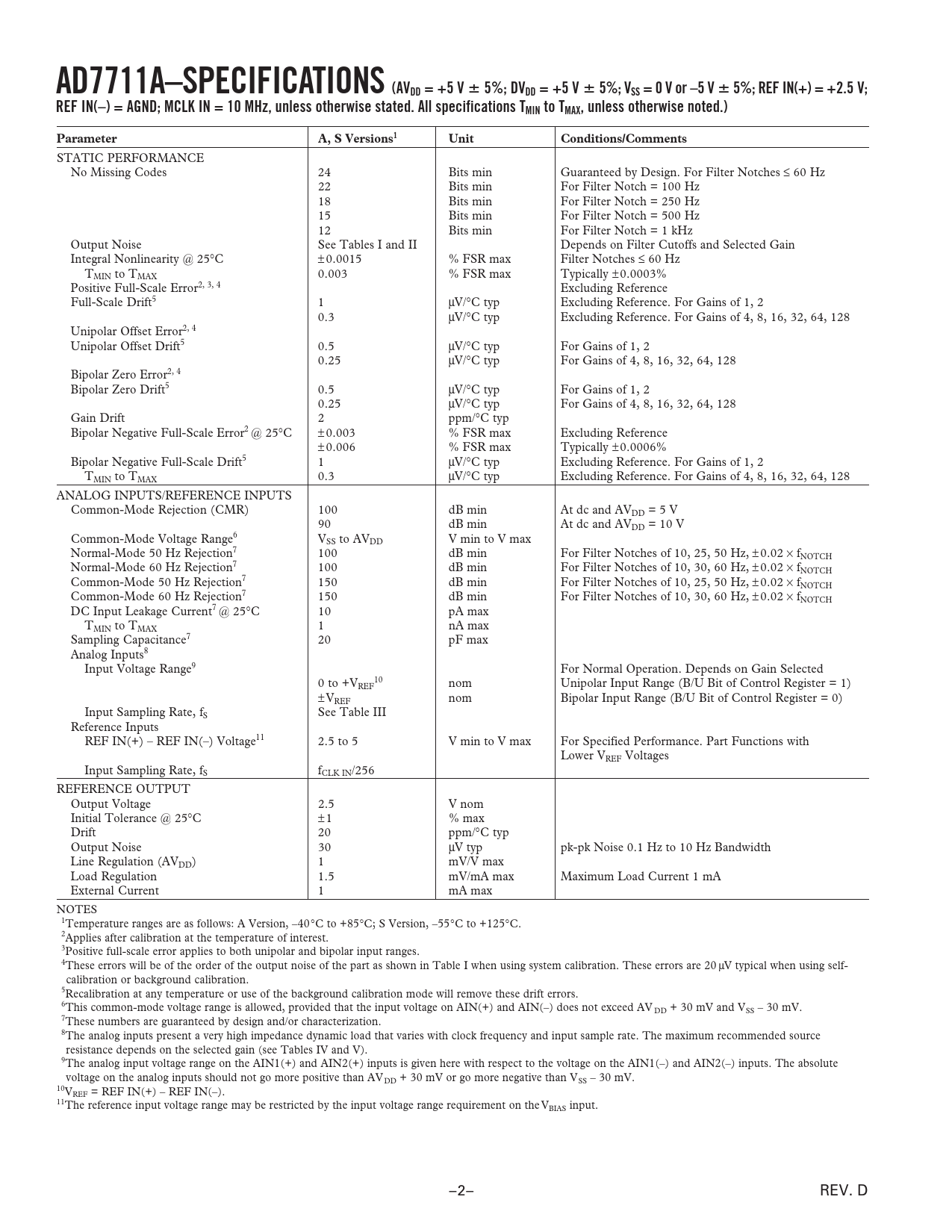 AD7711A(AVDD = +5 V 6 5%; DVDD = +5 V 6 5%; VSS = 0 V or –5 V 6 5%; REF IN(+) = +2.5 V;–SPECIFICATIONSREF IN(–) = AGND; MCLK IN = 10 MHz, unless otherwise stated. All specifications TMIN to TMAX, unless otherwise noted.)ParameterA, S Versions1UnitConditions/Comments STATIC PERFORMANCE No Missing Codes 24 Bits min Guaranteed by Design. For Filter Notches £ 60 Hz 22 Bits min For Filter Notch = 100 Hz 18 Bits min For Filter Notch = 250 Hz 15 Bits min For Filter Notch = 500 Hz 12 Bits min For Filter Notch = 1 kHz Output Noise See Tables I and II Depends on Filter Cutoffs and Selected Gain Integral Nonlinearity @ 25rC ± 0.0015 % FSR max Filter Notches £ 60 Hz TMIN to TMAX 0.003 % FSR max Typically ± 0.0003% Positive Full-Scale Error2, 3, 4 Excluding Reference Full-Scale Drift5 1 mV/rC typ Excluding Reference. For Gains of 1, 2 0.3 mV/rC typ Excluding Reference. For Gains of 4, 8, 16, 32, 64, 128 Unipolar Offset Error2, 4 Unipolar Offset Drift5 0.5 mV/rC typ For Gains of 1, 2 0.25 mV/rC typ For Gains of 4, 8, 16, 32, 64, 128 Bipolar Zero Error2, 4 Bipolar Zero Drift5 0.5 mV/rC typ For Gains of 1, 2 0.25 mV/rC typ For Gains of 4, 8, 16, 32, 64, 128 Gain Drift 2 ppm/rC typ Bipolar Negative Full-Scale Error2 @ 25rC ± 0.003 % FSR max Excluding Reference ± 0.006 % FSR max Typically ± 0.0006% Bipolar Negative Full-Scale Drift5 1 mV/rC typ Excluding Reference. For Gains of 1, 2 TMIN to TMAX 0.3 mV/rC typ Excluding Reference. For Gains of 4, 8, 16, 32, 64, 128 ANALOG INPUTS/REFERENCE INPUTS Common-Mode Rejection (CMR) 100 dB min At dc and AVDD = 5 V 90 dB min At dc and AVDD = 10 V Common-Mode Voltage Range6 VSS to AVDD V min to V max Normal-Mode 50 Hz Rejection7 100 dB min For Filter Notches of 10, 25, 50 Hz, ± 0.02 ¥ fNOTCH Normal-Mode 60 Hz Rejection7 100 dB min For Filter Notches of 10, 30, 60 Hz, ± 0.02 ¥ fNOTCH Common-Mode 50 Hz Rejection7 150 dB min For Filter Notches of 10, 25, 50 Hz, ± 0.02 ¥ fNOTCH Common-Mode 60 Hz Rejection7 150 dB min For Filter Notches of 10, 30, 60 Hz, ± 0.02 ¥ fNOTCH DC Input Leakage Current7 @ 25rC 10 pA max TMIN to TMAX 1 nA max Sampling Capacitance7 20 pF max Analog Inputs8 Input Voltage Range9 For Normal Operation. Depends on Gain Selected 0 to +V 10 REF nom Unipolar Input Range (B/U Bit of Control Register = 1) ± VREF nom Bipolar Input Range (B/U Bit of Control Register = 0) Input Sampling Rate, fS See Table III Reference Inputs REF IN(+) – REF IN(–) Voltage11 2.5 to 5 V min to V max For Specified Performance. Part Functions with Lower VREF Voltages Input Sampling Rate, fS fCLK IN/256 REFERENCE OUTPUT Output Voltage 2.5 V nom Initial Tolerance @ 25rC ± 1 % max Drift 20 ppm/rC typ Output Noise 30 mV typ pk-pk Noise 0.1 Hz to 10 Hz Bandwidth Line Regulation (AVDD) 1 mV/V max Load Regulation 1.5 mV/mA max Maximum Load Current 1 mA External Current 1 mA max NOTES 1Temperature ranges are as follows: A Version, –40rC to +85rC; S Version, –55rC to +125rC. 2Applies after calibration at the temperature of interest. 3Positive full-scale error applies to both unipolar and bipolar input ranges. 4These errors will be of the order of the output noise of the part as shown in Table I when using system calibration. These errors are 20 mV typical when using self- calibration or background calibration. 5Recalibration at any temperature or use of the background calibration mode will remove these drift errors. 6This common-mode voltage range is allowed, provided that the input voltage on AIN(+) and AIN(–) does not exceed AV DD + 30 mV and VSS – 30 mV. 7These numbers are guaranteed by design and/or characterization. 8The analog inputs present a very high impedance dynamic load that varies with clock frequency and input sample rate. The maximum recommended source resistance depends on the selected gain (see Tables IV and V). 9The analog input voltage range on the AIN1(+) and AIN2(+) inputs is given here with respect to the voltage on the AIN1(–) and AIN2(–) inputs. The absolute voltage on the analog inputs should not go more positive than AV DD + 30 mV or go more negative than VSS – 30 mV. 10VREF = REF IN(+) – REF IN(–). 11The reference input voltage range may be restricted by the input voltage range requirement on the VBIAS input. –2– REV. D
