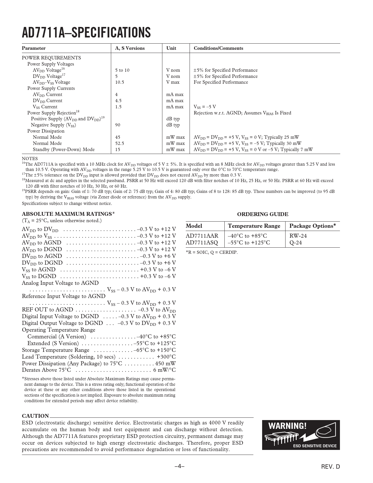 AVDD to DVDD . –0.3 V to +12 V AVDD to VSS . –0.3 V to +12 V AD7711AAR –40rC to +85rC RW-24 AVDD to AGND . –0.3 V to +12 V AD7711ASQ –55rC to +125rC Q-24 AVDD to DGND . –0.3 V to +12 V *R = SOIC, Q = CERDIP. DVDD to AGND . –0.3 V to +6 V DVDD to DGND . –0.3 V to +6 V VSS to AGND . +0.3 V to –6 V VSS to DGND . +0.3 V to –6 V Analog Input Voltage to AGND . VSS – 0.3 V to AVDD + 0.3 V Reference Input Voltage to AGND . VSS – 0.3 V to AVDD + 0.3 V REF OUT to AGND . –0.3 V to AVDD Digital Input Voltage to DGND . –0.3 V to AVDD + 0.3 V Digital Output Voltage to DGND . –0.3 V to DVDD + 0.3 V Operating Temperature Range Commercial (A Version) . –40rC to +85rC Extended (S Version) . –55rC to +125rC Storage Temperature Range . –65rC to +150rC Lead Temperature (Soldering, 10 secs) . +300rC Power Dissipation (Any Package) to 75rC . 450 mW Derates Above 75rC . 6 mW/rC *Stresses above those listed under Absolute Maximum Ratings may cause perma- nent damage to the device. This is a stress rating only; functional operation of the device at these or any other conditions above those listed in the operational sections of the specification is not implied. Exposure to absolute maximum rating conditions for extended periods may affect device reliability.