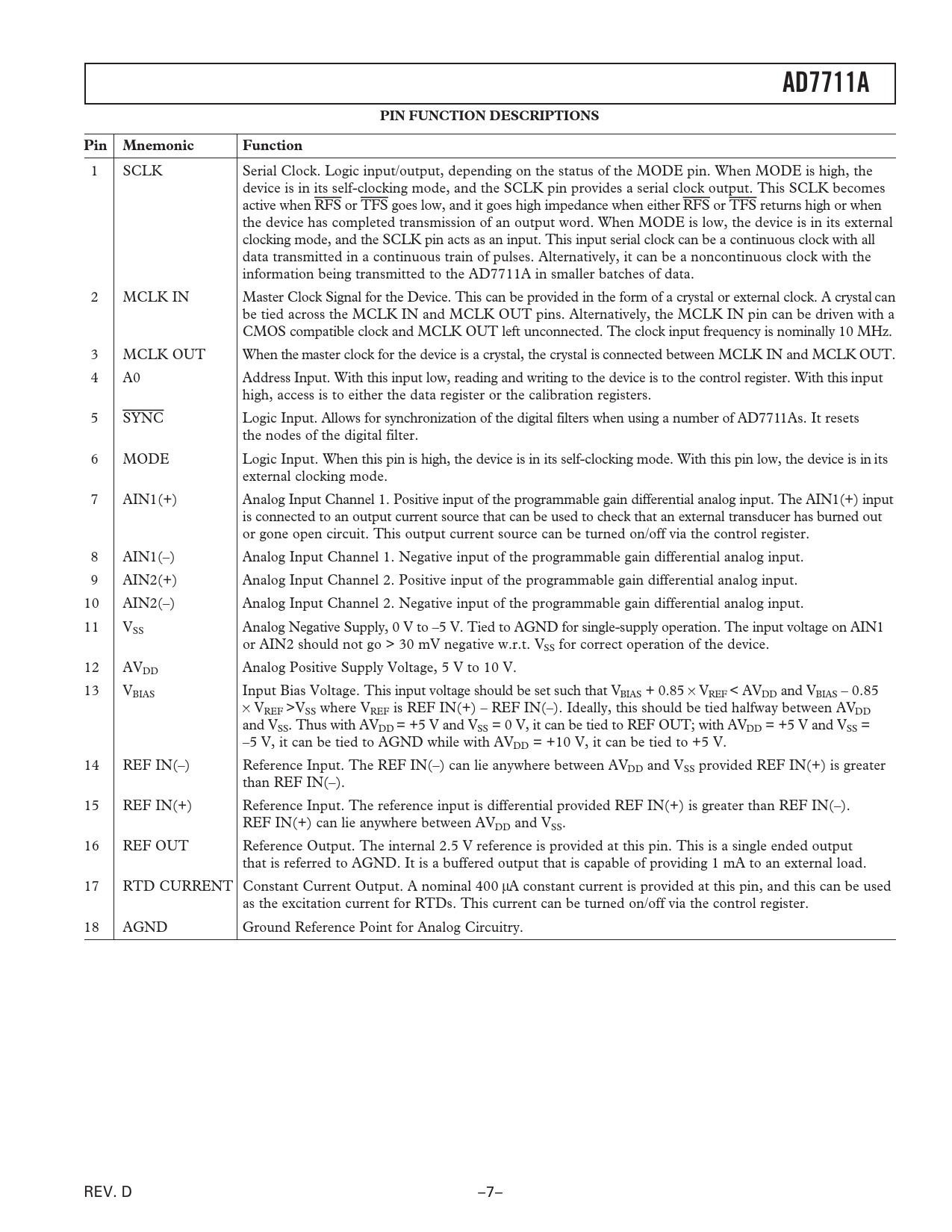 data transmitted in a continuous train of pulses. Alternatively, it can be a noncontinuous clock with the information being transmitted to the AD7711A in smaller batches of data. 2 MCLK IN Master Clock Signal for the Device. This can be provided in the form of a crystal or external clock. A crystal can be tied across the MCLK IN and MCLK OUT pins. Alternatively, the MCLK IN pin can be driven with a CMOS compatible clock and MCLK OUT left unconnected. The clock input frequency is nominally 10 MHz. 3 MCLK OUT When the master clock for the device is a crystal, the crystal is connected between MCLK IN and MCLK OUT. 4 A0 Address Input. With this input low, reading and writing to the device is to the control register. With this input high, access is to either the data register or the calibration registers. 5 SYNC Logic Input. Allows for synchronization of the digital filters when using a number of AD7711As. It resets the nodes of the digital filter. 6 MODE Logic Input. When this pin is high, the device is in its self-clocking mode. With this pin low, the device is in its external clocking mode. 7 AIN1(+) Analog Input Channel 1. Positive input of the programmable gain differential analog input. The AIN1(+) input is connected to an output current source that can be used to check that an external transducer has burned out or gone open circuit. This output current source can be turned on/off via the control register. 8 AIN1(–) Analog Input Channel 1. Negative input of the programmable gain differential analog input. 9 AIN2(+) Analog Input Channel 2. Positive input of the programmable gain differential analog input. 10 AIN2(–) Analog Input Channel 2. Negative input of the programmable gain differential analog input. 11 VSS Analog Negative Supply, 0 V to –5 V. Tied to AGND for single-supply operation. The input voltage on AIN1 or AIN2 should not go > 30 mV negative w.r.t. VSS for correct operation of the device. 12 AVDD Analog Positive Supply Voltage, 5 V to 10 V. 13 VBIAS Input Bias Voltage. This input voltage should be set such that VBIAS + 0.85 ¥ VREF < AVDD and VBIAS – 0.85 ¥ VREF >VSS where VREF is REF IN(+) – REF IN(–). Ideally, this should be tied halfway between AVDD and VSS. Thus with AVDD = +5 V and VSS = 0 V, it can be tied to REF OUT; with AVDD = +5 V and VSS = –5 V, it can be tied to AGND while with AVDD = +10 V, it can be tied to +5 V. 14 REF IN(–) Reference Input. The REF IN(–) can lie anywhere between AVDD and VSS provided REF IN(+) is greater than REF IN(–). 15 REF IN(+) Reference Input. The reference input is differential provided REF IN(+) is greater than REF IN(–). REF IN(+) can lie anywhere between AVDD and VSS. 16 REF OUT Reference Output. The internal 2.5 V reference is provided at this pin. This is a single ended output that is referred to AGND. It is a buffered output that is capable of providing 1 mA to an external load. 17 RTD CURRENT Constant Current Output. A nominal 400 mA constant current is provided at this pin, and this can be used as the excitation current for RTDs. This current can be turned on/off via the control register. 18 AGND Ground Reference Point for Analog Circuitry. REV. D –7–