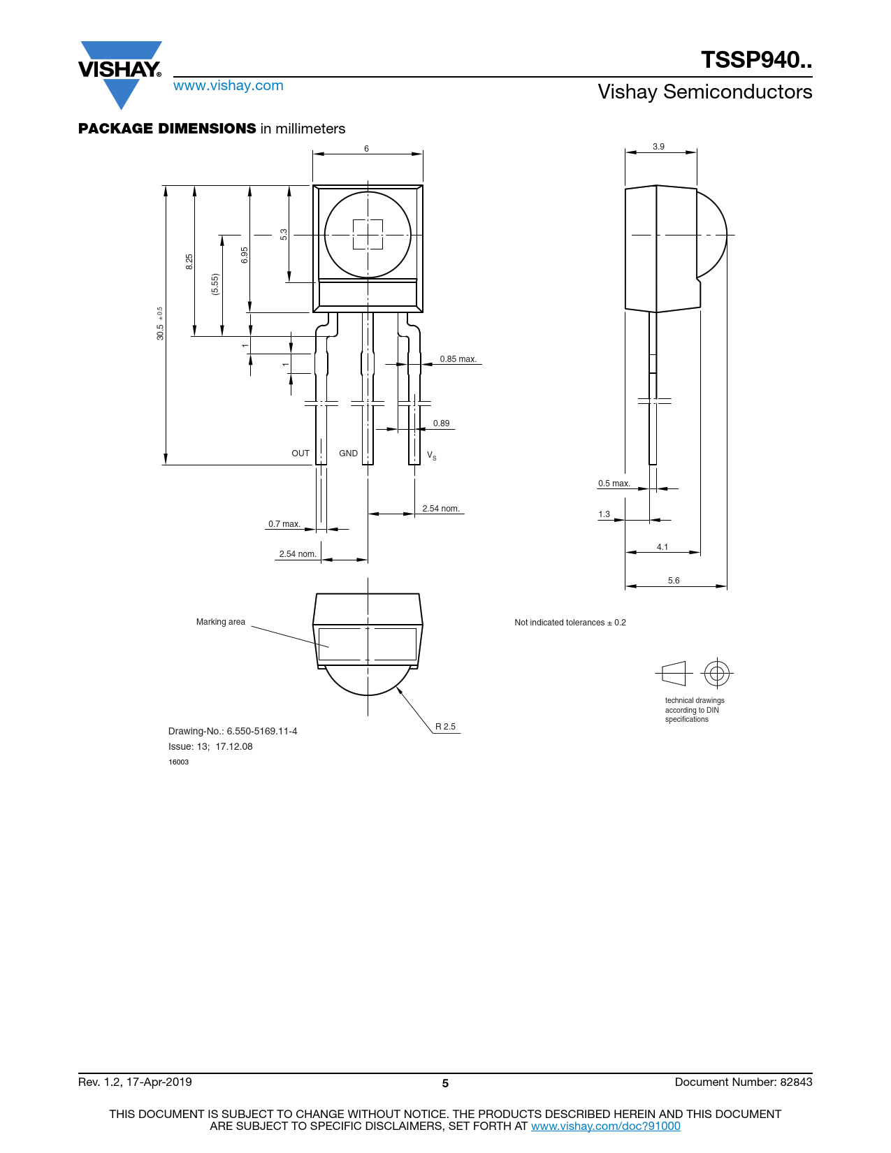 TSSP940.. www.vishay.com Vishay Semiconductors PACKAGE DIMENSIONS in millimeters 3.9 6 5.3 6.95 8.25 (5.55) ± 0.5 30.5 1 0.85 max. 1 0.89 OUT GND VS 0.5 max. 2.54 nom. 1.3 0.7 max. 4.1 2.54 nom. 5.6 Marking area Not indicated tolerances ± 0.2 technical drawings according to DIN specifications Drawing-No.: 6.550-5169.11-4 R 2.5 Issue: 13; 17.12.08 16003 Rev. 1.2, 17-Apr-2019 5 Document Number: 82843 THIS DOCUMENT IS SUBJECT TO CHANGE WITHOUT NOTICE. THE PRODUCTS DESCRIBED HEREIN AND THIS DOCUMENT ARE SUBJECT TO SPECIFIC DISCLAIMERS, SET FORTH AT www.vishay.com/doc?91000