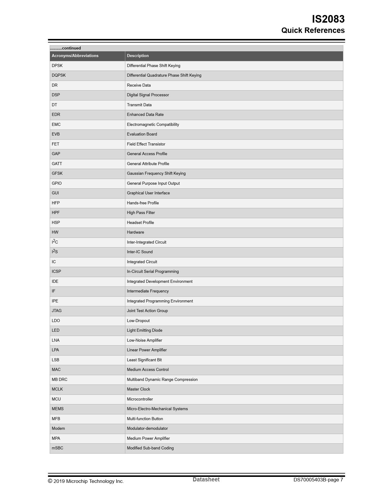 IS2083. Quick References. ...continued. Acronyms/Abbreviations. Description. Datasheet