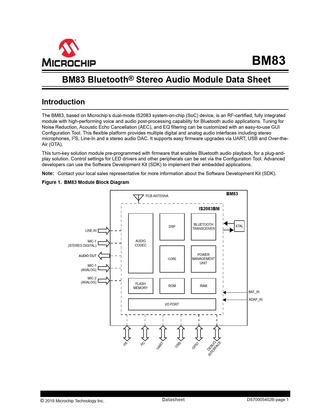 BM83. BM83 Bluetooth® Stereo Audio Module Data Sheet. Introduction. Note: . Figure 1. BM83 Module Block Diagram. IS2083BM