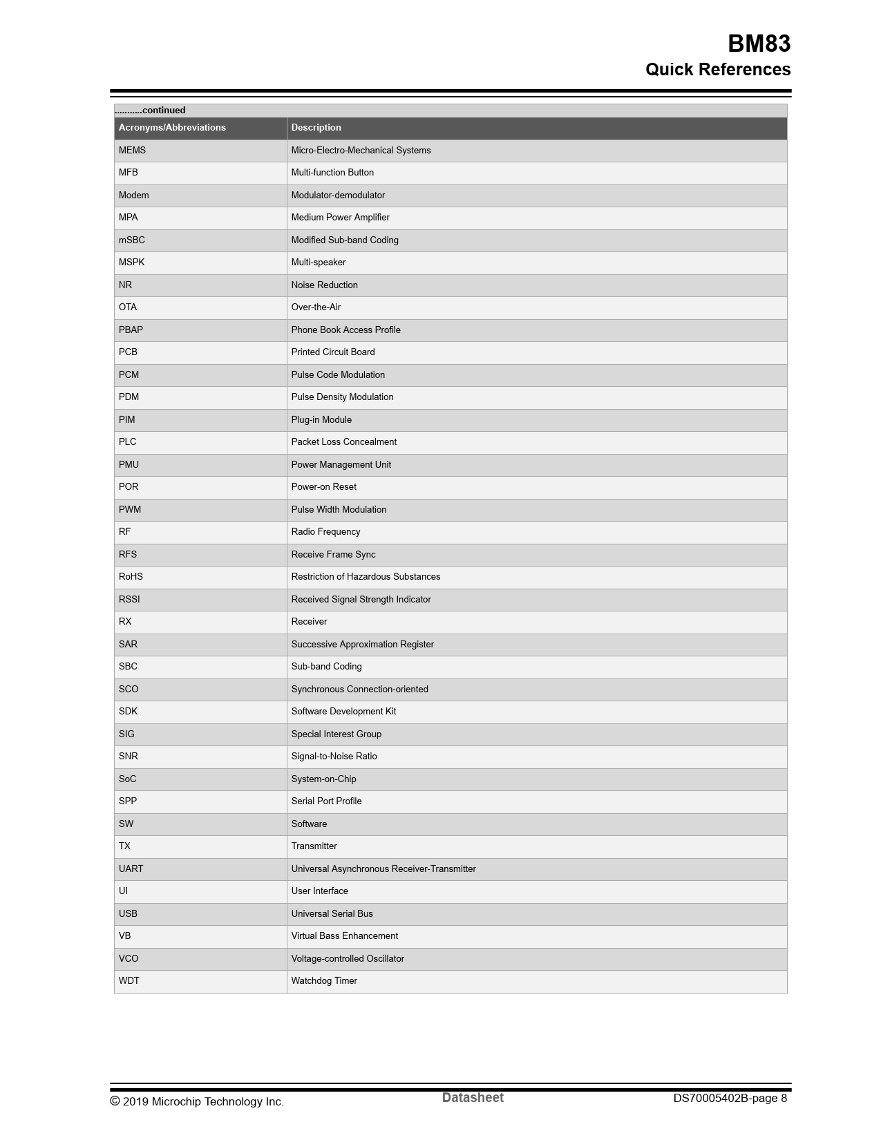 BM83. Quick References. ...continued. Acronyms/Abbreviations. Description. Datasheet