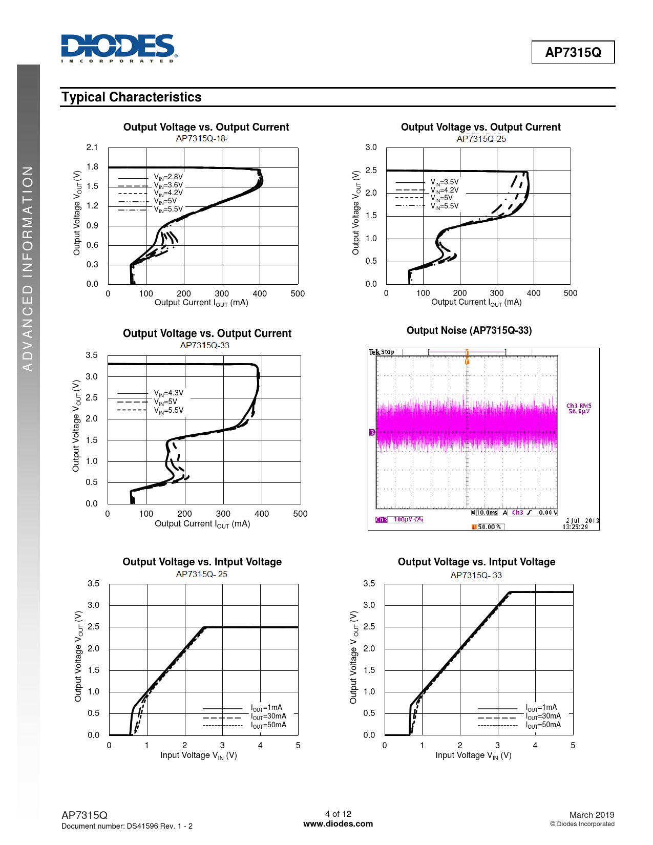 AP7315Q. Typical Characteristics. Output Voltage vs. Output Current. I D. Output Noise (AP7315Q-33). ADVAN