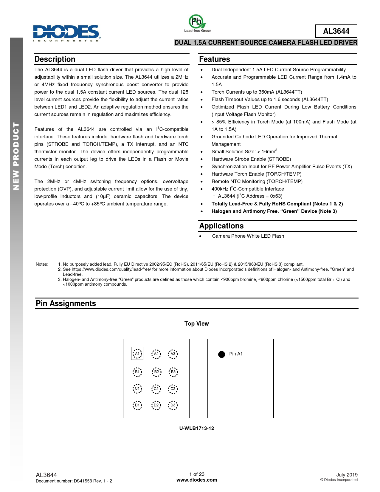 | 页数 / 页 | 23 / 1 — AL3644. DUAL 1.5A CURRENT SOURCE CAMERA FLASH LED DRIVER. Description. … |