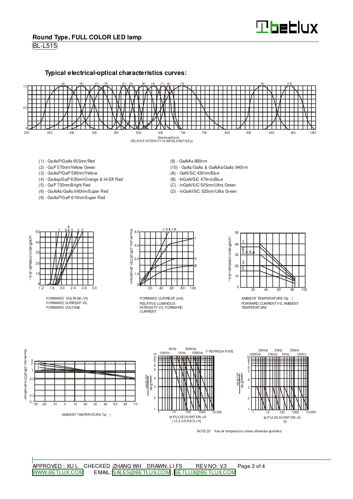 (A) (B ) (C) ( D) (2) (3) (8) ( 4) (1) (6) ( 5) (9) (10) 1.0 0.5 0 350 400 450 500 550 600 650 700 750 800 850 900 950 1000 Wav elength(nm) RELATIV E INTENS ITY Vs WA VELE NGT H(¦Ë p) ( 1) - GaAsP/GaAs 655nm/Red (9) - GaAlAs 880nm ( 2) - GaP 570nm/Yellow Green (10) - GaAs/GaAs & GaAlAs/GaAs 940nm ( 3) - GaAsP/GaP 585nm/Yellow (A) - GaN/SiC 430nm/Blue ( 4) - GaAsp/GaP 635nm/Orange & Hi-Eff Red (B) - InGaN/SiC 470nm/Blue ( 5) - GaP 700nm/Bright Red (C) - InGaN/SiC 505nm/Ultra Green ( 6) - GaAlAs/GaAs 660nm/Super Red (D) - InGaAl/SiC 525nm/Ultra Gr een ( 8) - GaAsP/GaP 610nm/Super Red 8 1 6 4 5 2 3 50 R 4.0 E 50 L F A 1 O T F R O 40 IV 1 W E R 3.0 40 W A L R A 6 U D R 30 M 2,4,8,A D C I 30 N U C O 2.0 5 R U R U 20 R 3 E S B R 20 N IN E N 5 T T (m T 10 E 1.0 ( A N m 10 ) S A IT ) 0 Y 0 1.2 1.6 2.0 2.4 2.6 3.0 20 40 60 80 100 0 20 40 60 80 100 FORWARD VOLTAGE (Vf) FORWARD CURRENT (mA) AMBIENT TEMPERATURE Ta( ) ℃ FORWARD CURRENT VS. RELATIVE LUMI NOUS FORWARD CURRENT VS. AMBIENT FORWARD VOLTAGE INTENSI TY VS. FORWARD TEMPERATURE CURRENT 3KHz 300KHz R 30KHz 3 KHz 300Hz E L 10 10KH z 1KHz 100KHz F-REFRESH R ATE 100KHz 10KHz 1KHz 100H z A 9 10 T I 3 9 V 1 8 8 E 2 7 5 7 L 4 6 U 2 6 M 1 3 5 5 IN I I D p O I I D p C e U 0.5 C e 4 a M k 4 S a M k A M IN A M X A X 3 T A . X 3 E . X . N . S 0.2 IT 2 2 Y 0.1-30 -20 -10 0 10 20 30 40 5 0 60 7 0 1 1 1 10 100 1000 10,000 1 10 100 1000 10,000 AMBIENT TEM PER ATUR E Ta(℃) tp-PU LSE DU RATION uS tp-P ULSE DU RATION uS (1,2 ,3 ,4,6,8,B.D.J. K) (5) NOTE:25℃ free air temperat ure unless otherwise sp ecifie d APPROVED : XU L CHECKED :ZHANG WH DRAWN: LI FS REV NO: V.3 Page 3 of 4 WWW.BETLUX.COM EMAIL: SALES@BETLUX.COM , BETLUX@BETLUX.COM