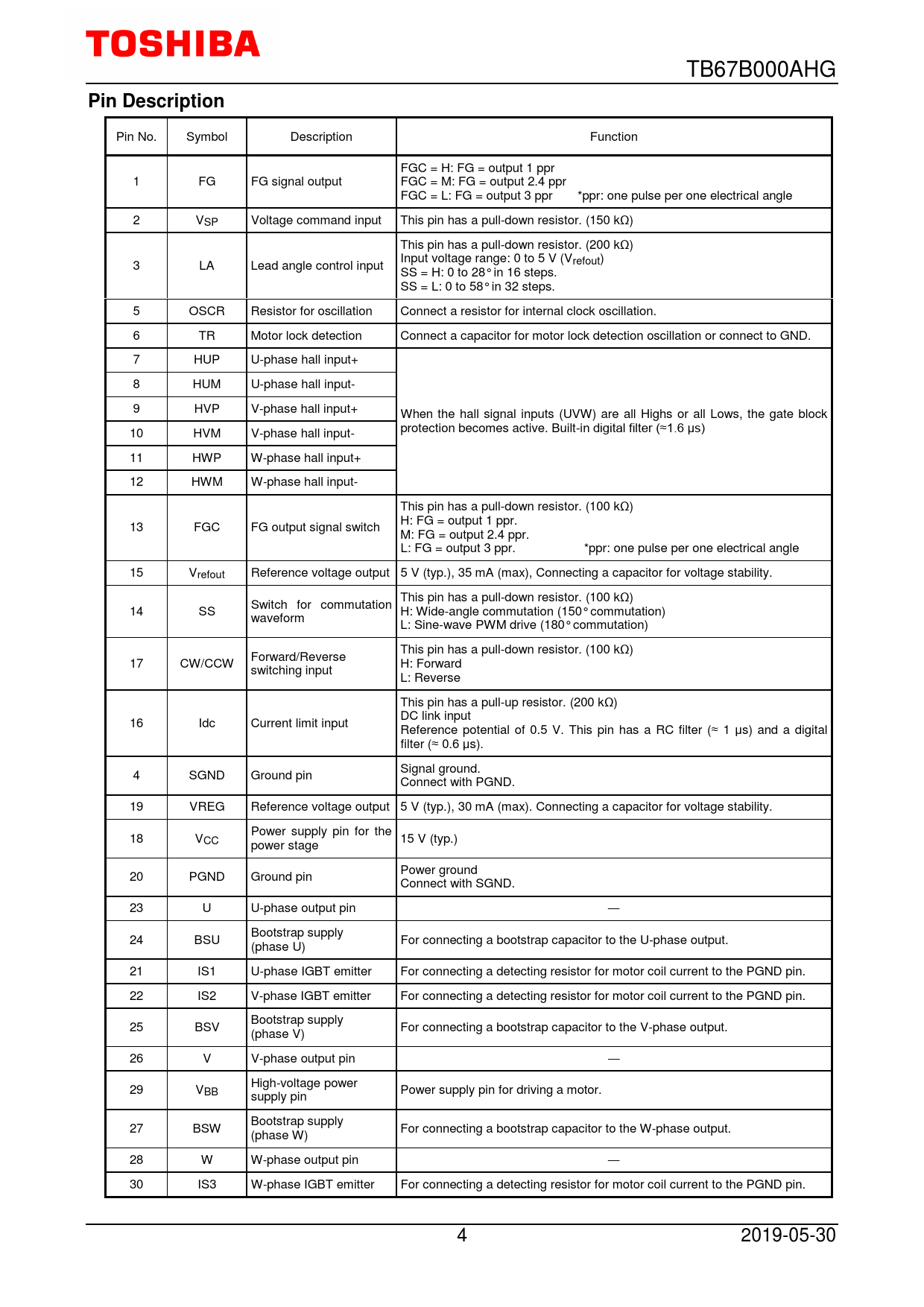 TB67B000AHG Pin Description Pin No. Symbol Description Function FGC = H: FG = output 1 ppr 1 FG FG signal output FGC = M: FG = output 2.4 ppr FGC = L: FG = output 3 ppr *ppr: one pulse per one electrical angle 2 VSP Voltage command input This pin has a pull-down resistor. (150 kΩ) This pin has a pull-down resistor. (200 kΩ) Input voltage range: 0 to 5 V (V 3 LA Lead angle control input refout) SS = H: 0 to 28° in 16 steps. SS = L: 0 to 58° in 32 steps. 5 OSCR Resistor for oscillation Connect a resistor for internal clock oscillation. 6 TR Motor lock detection Connect a capacitor for motor lock detection oscillation or connect to GND. 7 HUP U-phase hall input+ 8 HUM U-phase hall input- 9 HVP V-phase hall input+ When the hall signal inputs (UVW) are all Highs or all Lows, the gate block protection becomes active. Built-in digital filter (≈1.6 μs) 10 HVM V-phase hall input- 11 HWP W-phase hall input+ 12 HWM W-phase hall input- This pin has a pull-down resistor. (100 kΩ) H: FG = output 1 ppr. 13 FGC FG output signal switch M: FG = output 2.4 ppr. L: FG = output 3 ppr. *ppr: one pulse per one electrical angle 15 Vrefout Reference voltage output 5 V (typ.), 35 mA (max), Connecting a capacitor for voltage stability. This pin has a pull-down resistor. (100 kΩ) Switch for commutation 14 SS H: Wide-angle commutation (150° commutation) waveform L: Sine-wave PWM drive (180° commutation) This pin has a pull-down resistor. (100 kΩ) Forward/Reverse 17 CW/CCW H: Forward switching input L: Reverse This pin has a pull-up resistor. (200 kΩ) DC link input 16 Idc Current limit input Reference potential of 0.5 V. This pin has a RC filter (≈ 1 μs) and a digital filter (≈ 0.6 μs). Signal ground. 4 SGND Ground pin Connect with PGND. 19 VREG Reference voltage output 5 V (typ.), 30 mA (max). Connecting a capacitor for voltage stability. Power supply pin for the 18 VCC 15 V (typ.) power stage Power ground 20 PGND Ground pin Connect with SGND. 23 U U-phase output pin ― Bootstrap supply 24 BSU For connecting a bootstrap capacitor to the U-phase output. (phase U) 21 IS1 U-phase IGBT emitter For connecting a detecting resistor for motor coil current to the PGND pin. 22 IS2 V-phase IGBT emitter For connecting a detecting resistor for motor coil current to the PGND pin. Bootstrap supply 25 BSV For connecting a bootstrap capacitor to the V-phase output. (phase V) 26 V V-phase output pin ― High-voltage power 29 VBB Power supply pin for driving a motor. supply pin Bootstrap supply 27 BSW For connecting a bootstrap capacitor to the W-phase output. (phase W) 28 W W-phase output pin ― 30 IS3 W-phase IGBT emitter For connecting a detecting resistor for motor coil current to the PGND pin. 4 2019-05-30 Document Outline TOSHIBA Bi-CMOS Power Integrated Circuit Multi-Chip Package (MCP) High voltage 3-Phase Full-Wave PWM Brushless Motor Driver Features Block Diagram Pin Assignment Pin Description Input/Output Equivalent Circuits Absolute Maximum Ratings (Ta = 25 C) Operating conditions (Ta = 25 C) Power Dissipation Electrical Characteristics (Ta = 25 C) Functional Description 1. Basic Operation 2. Voltage Command (VSP) Signal and Bootstrap Voltage Regulation 3. Dead Time Insertion (cross conduction protection) 4. Lead Angle Control 5. PWM Carrier Frequency 6. Position Detecting Pin <Hall device input> <Hall IC input> 7. Rotating Pulse Output Timing Chart of FG Signal 8. Protection-related Functions 9. Motor-lock detection Timing Chart Timing Chart 1: Output waveform of sine-wave PWM drive Timing Chart 2: Output waveform of sine-wave PWM drive Timing Chart 3: Output waveform of wide-angle commutation Timing Chart 4: Output waveform of wide-angle commutation Timing Chart 5: Output waveform of square-wave drive Timing Chart 6: Output waveform of square-wave drive Timing Chart 7: Output waveform of square-wave drive Timing Chart 8: Output waveform of square-wave drive Application Circuit Example External Parts Package Dimensions Notes on Contents IC Usage Considerations Notes on handling of ICs PD MAX – Ta 40 Power dissipation PD MAX (W) 30 20 10 0 0 25 50 75 100 125 150 Ambient temperature Ta ( C) ① INFINITE HEAT SINK : R(j-c = 1 C/W ② When mounted on the board (74.2 × 114.3 × 1.6 mm, Cu20%), HEAT SINK (10 × 10 × 1 mm, Cu) : R(j-a = 17 C/W ③ When mounted on the board (74.2 × 114.3 × 1.6 mm, Cu20%) : R(j-a = 35 C/W ④ IC only : R(j-a = 53 C/W PWM Duty (1) (2) (3) 92% 2.1 V 1.0 V 5.4 V VSP (4) 7.3 V 8.2 V 10 V (1) (2) (3) 2.1 V 1.0 V 5.4 V VSP (4) 7.3 V 8.2 V 10 V PWM Duty (Upper phase) *95% (typ.) *2.4% (typ.) RESTRICTIONS ON PRODUCT USE