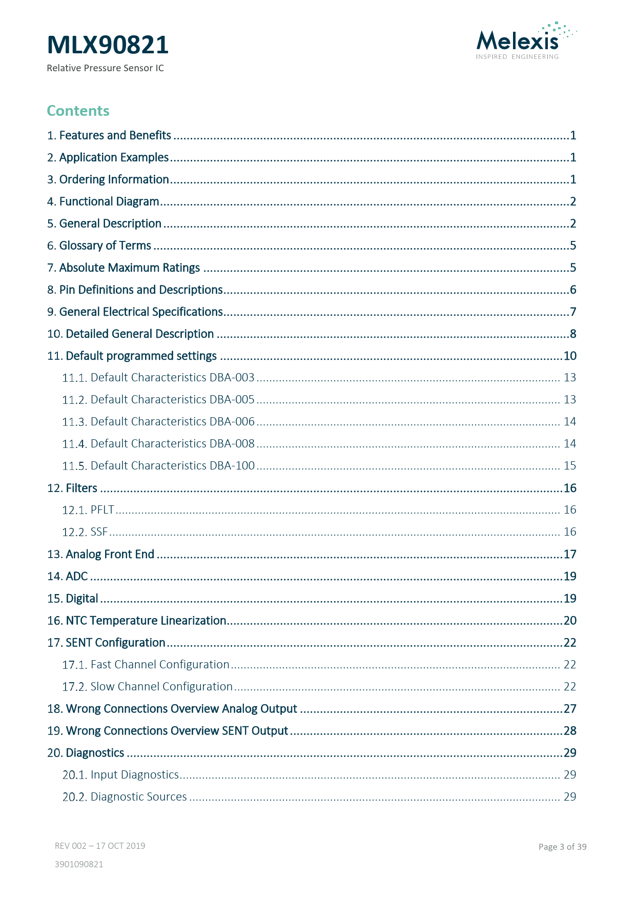 Features and Benefits ... 1 Application Examples .. 1 Ordering Information .. 1 Functional Diagram ... 2 General Description .. 2 Glossary of Terms ... 5 Absolute Maximum Ratings .. 5 Pin Definitions and Descriptions .. 6 General Electrical Specifications .. 7 Detailed General Description .. 8 Default programmed settings ... 10 Default Characteristics DBA-003 ... 13 Default Characteristics DBA-005 ... 13 Default Characteristics DBA-006 ... 14 Default Characteristics DBA-008 ... 14 Default Characteristics DBA-100 ... 15 Filters ... 16 PFLT ... 16 SSF ... 16 Analog Front End .. 17 ADC .. 19 Digital ... 19 NTC Temperature Linearization... 20 SENT Configuration ... 22 Fast Channel Configuration ... 22 Slow Channel Configuration .. 22 Wrong Connections Overview Analog Output ... 27 Wrong Connections Overview SENT Output .. 28 Diagnostics ... 29 Input Diagnostics ... 29 Diagnostic Sources .. 29 REV 002 – 17 OCT 2019 Page 3 of 39 3901090821