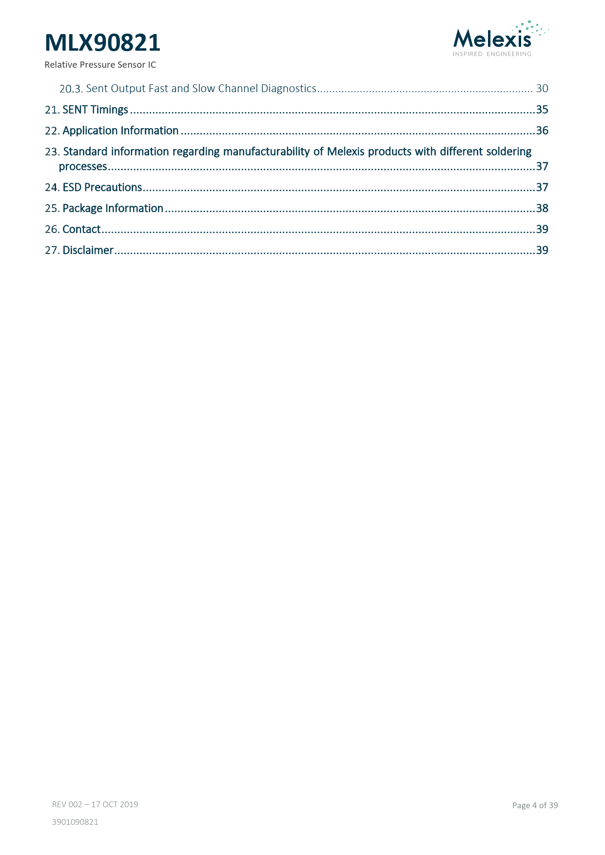 Relative Pressure Sensor IC Sent Output Fast and Slow Channel Diagnostics ... 30 SENT Timings .. 35 Application Information .. 36 Standard information regarding manufacturability of Melexis products with different soldering processes ... 37 ESD Precautions .. 37 Package Information ... 38 Contact ... 39 Disclaimer ... 39 REV 002 – 17 OCT 2019 Page 4 of 39 3901090821