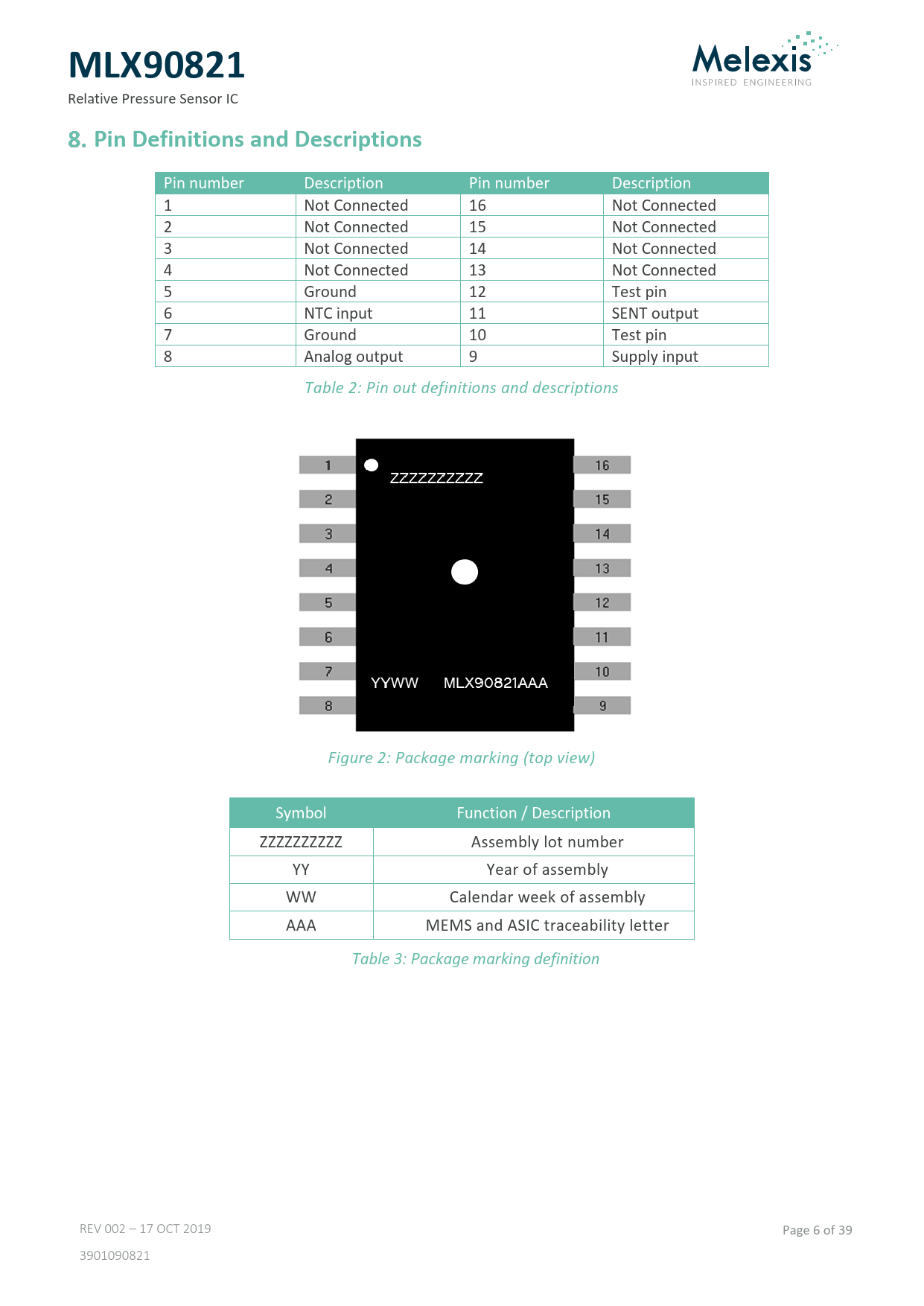 MLX90821 Relative Pressure Sensor IC Pin Definitions and Descriptions Pin number Description Pin number Description 1 Not Connected 16 Not Connected 2 Not Connected 15 Not Connected 3 Not Connected 14 Not Connected 4 Not Connected 13 Not Connected 5 Ground 12 Test pin 6 NTC input 11 SENT output 7 Ground 10 Test pin 8 Analog output 9 Supply input Table 2: Pin out definitions and descriptions Figure 2: Package marking (top view) Symbol Function / Description ZZZZZZZZZZ Assembly lot number YY Year of assembly WW Calendar week of assembly AAA MEMS and ASIC traceability letter Table 3: Package marking definition REV 002 – 17 OCT 2019 Page 6 of 39 3901090821