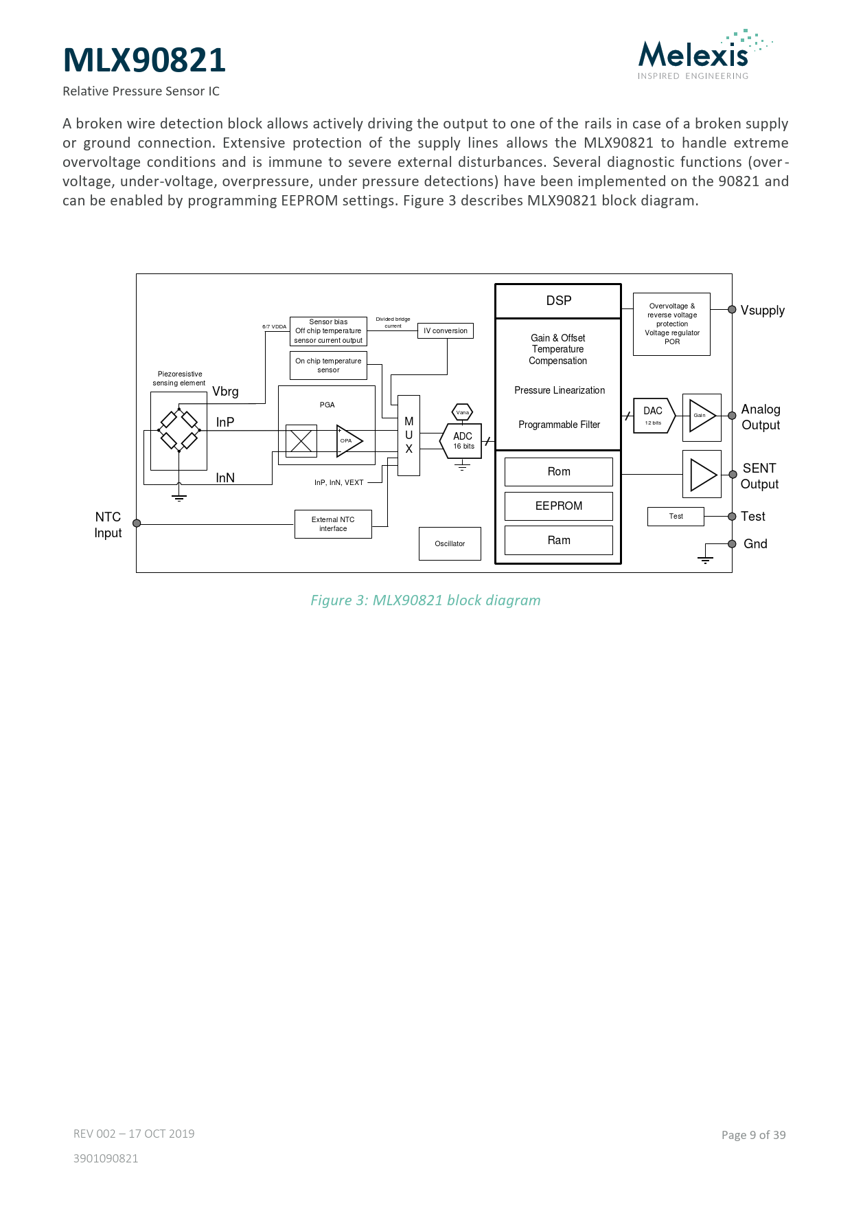 link to page 9 MLX90821 Relative Pressure Sensor IC A broken wire detection block allows actively driving the output to one of the rails in case of a broken supply or ground connection. Extensive protection of the supply lines allows the MLX90821 to handle extreme overvoltage conditions and is immune to severe external disturbances. Several diagnostic functions (over - voltage, under-voltage, overpressure, under pressure detections) have been implemented on the 90821 and can be enabled by programming EEPROM settings. Figure 3 describes MLX90821 block diagram. DSP Overvoltage & Vsupply reverse voltage Sensor bias Divided bridge protection 6/7 VDDA current Off chip temperature IV conversion Voltage regulator sensor current output Gain & Offset POR Temperature On chip temperature Compensation sensor Piezoresistive sensing element Vbrg Pressure Linearization PGA Vana DAC Analog Gain InP M Programmable Filter 12 bits Output U ADC OPA X 16 bits Rom SENT InN InP, InN, VEXT Output EEPROM Test NTC External NTC Test interface Input Oscillator Ram Gnd Figure 3: MLX90821 block diagram REV 002 – 17 OCT 2019 Page 9 of 39 3901090821