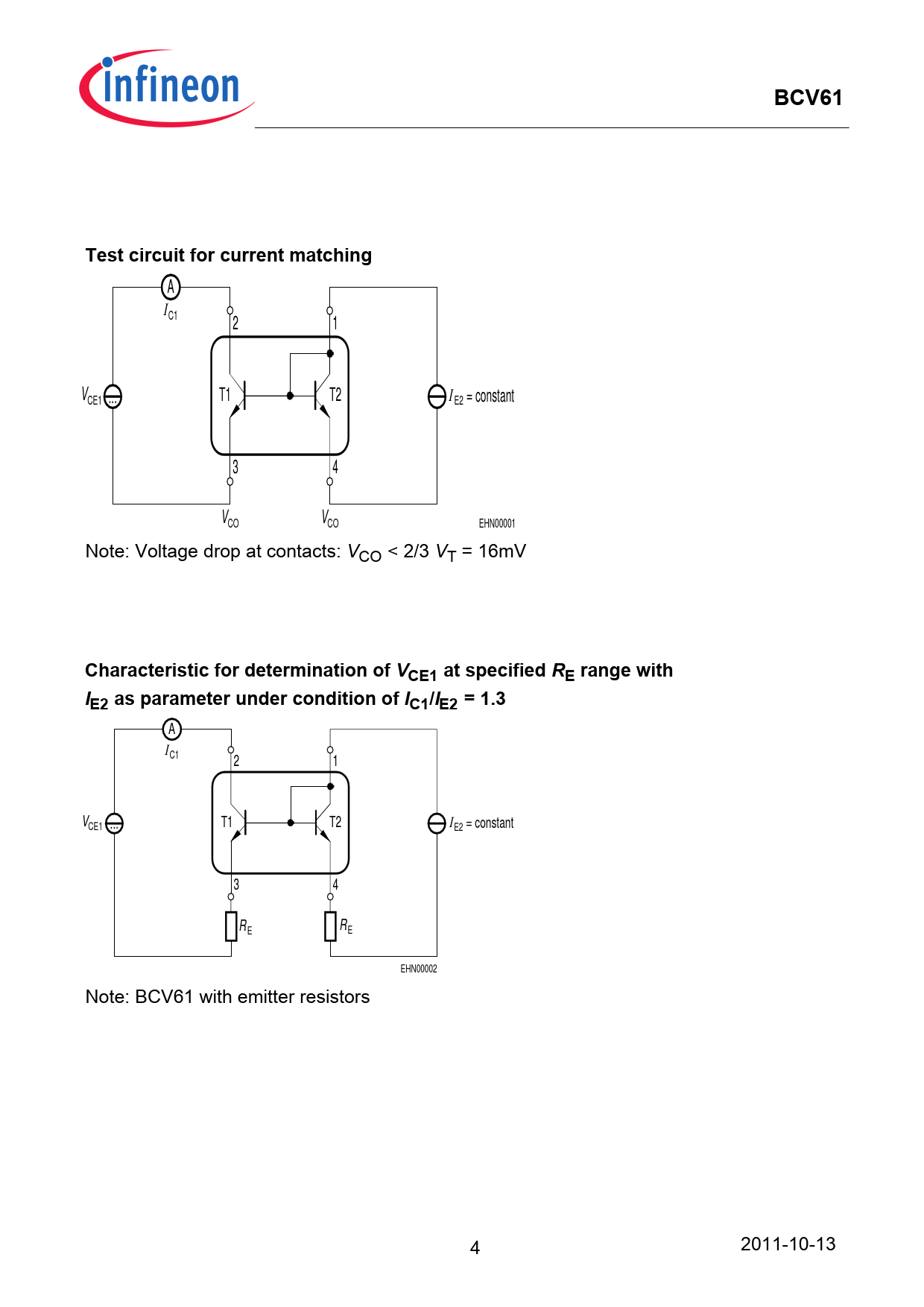 BCV61Test circuit for current matching A ΙC1 2 1 V Ι CE1 ... T1 T2 E2 = constant 3 4 CO V CO V EHN00001 Note: Voltage drop at contacts: VCO < 2/3 VT = 16mV Characteristic for determination of VCE1 at specified RE range with IE2 as parameter under condition of IC1/IE2 = 1.3 A ΙC1 2 1 V Ι CE1 ... T1 T2 E2 = constant 3 4 R R E E EHN00002 Note: BCV61 with emitter resistors 4 2011-10-13