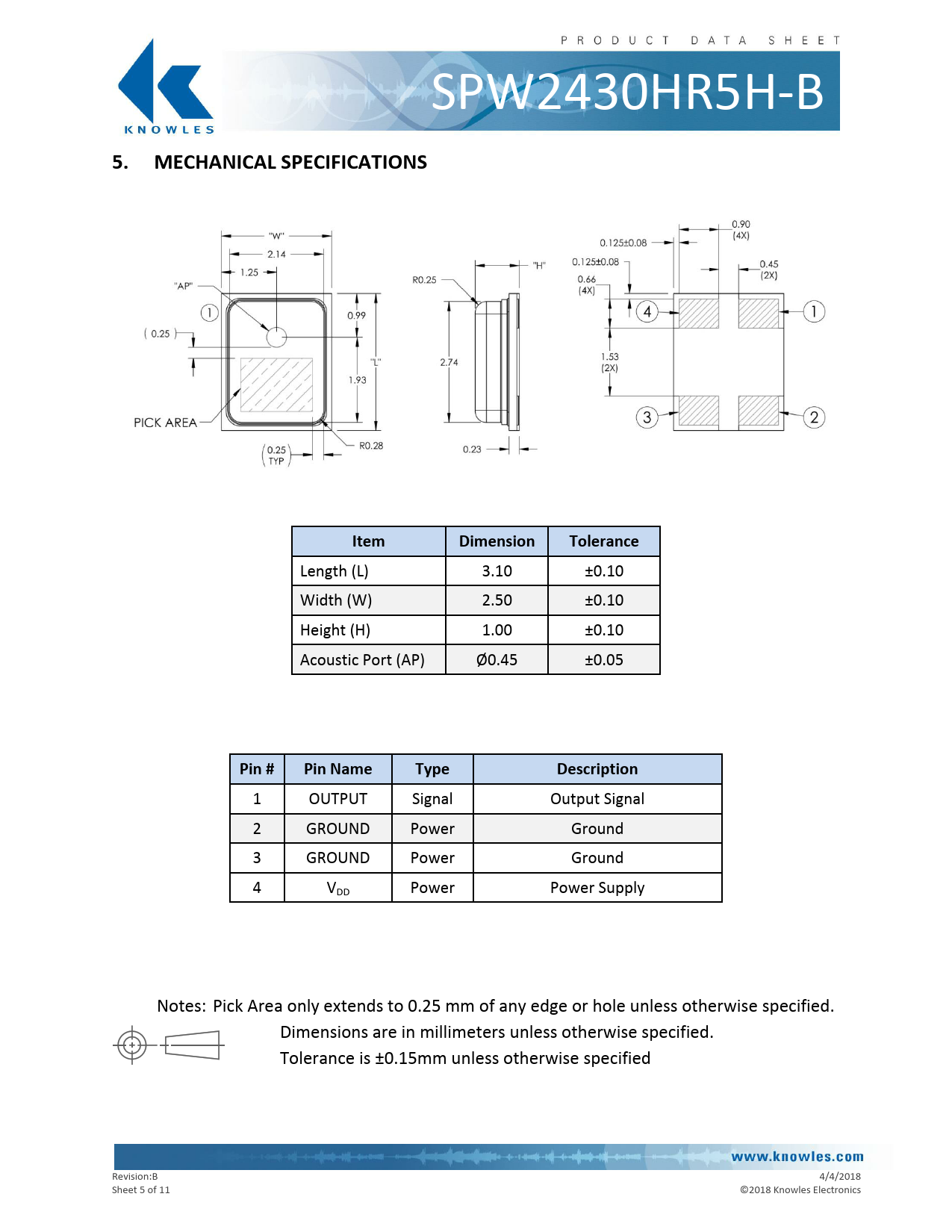 1 OUTPUT Signal Output Signal 2 GROUND Power Ground 3 GROUND Power Ground 4 VDD Power Power Supply Notes: Pick Area only extends to 0.25 mm of any edge or hole unless otherwise specified. Dimensions are in millimeters unless otherwise specified. Tolerance is ±0.15mm unless otherwise specified Revision:B 4/4/2018 Sheet 5 of 11 © 2018 Knowles Electronics