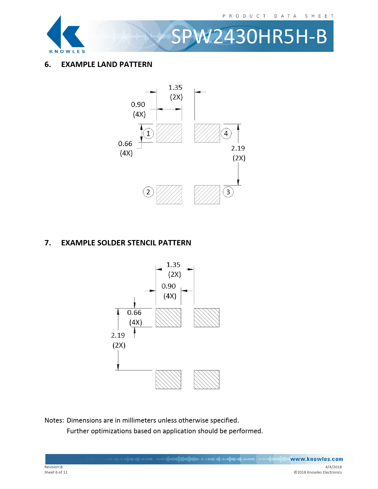 Notes: Dimensions are in millimeters unless otherwise specified. Further optimizations based on application should be performed. Revision:B 4/4/2018 Sheet 6 of 11 © 2018 Knowles Electronics