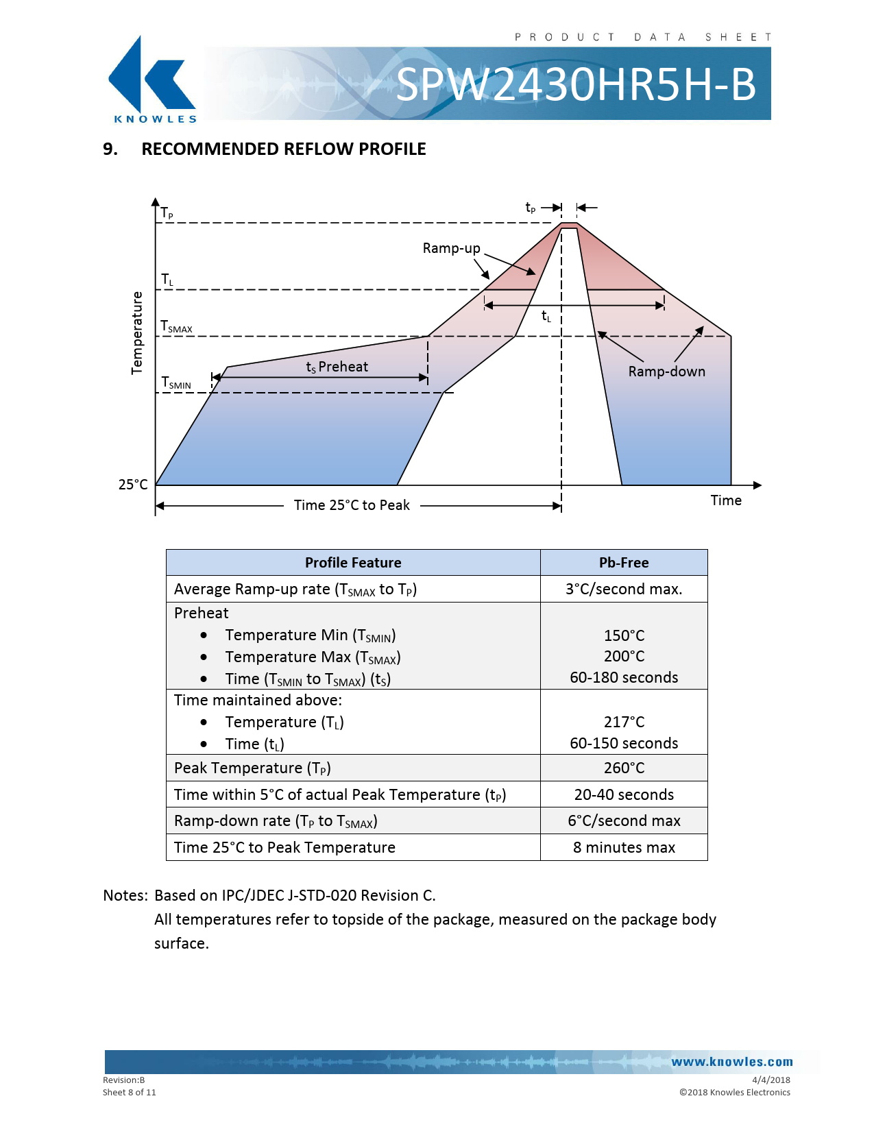 Average Ramp-up rate (TSMAX to TP) 3°C/second max. Preheat Temperature Min (TSMIN) 150°C Temperature Max (TSMAX) 200°C Time (TSMIN to TSMAX) (tS) 60-180 seconds Time maintained above: Temperature (TL) 217°C Time (tL) 60-150 seconds Peak Temperature (TP) 260°C Time within 5°C of actual Peak Temperature (tP) 20-40 seconds Ramp-down rate (TP to TSMAX) 6°C/second max Time 25°C to Peak Temperature 8 minutes max Notes: Based on IPC/JDEC J-STD-020 Revision C. All temperatures refer to topside of the package, measured on the package body surface. Revision:B 4/4/2018 Sheet 8 of 11 © 2018 Knowles Electronics