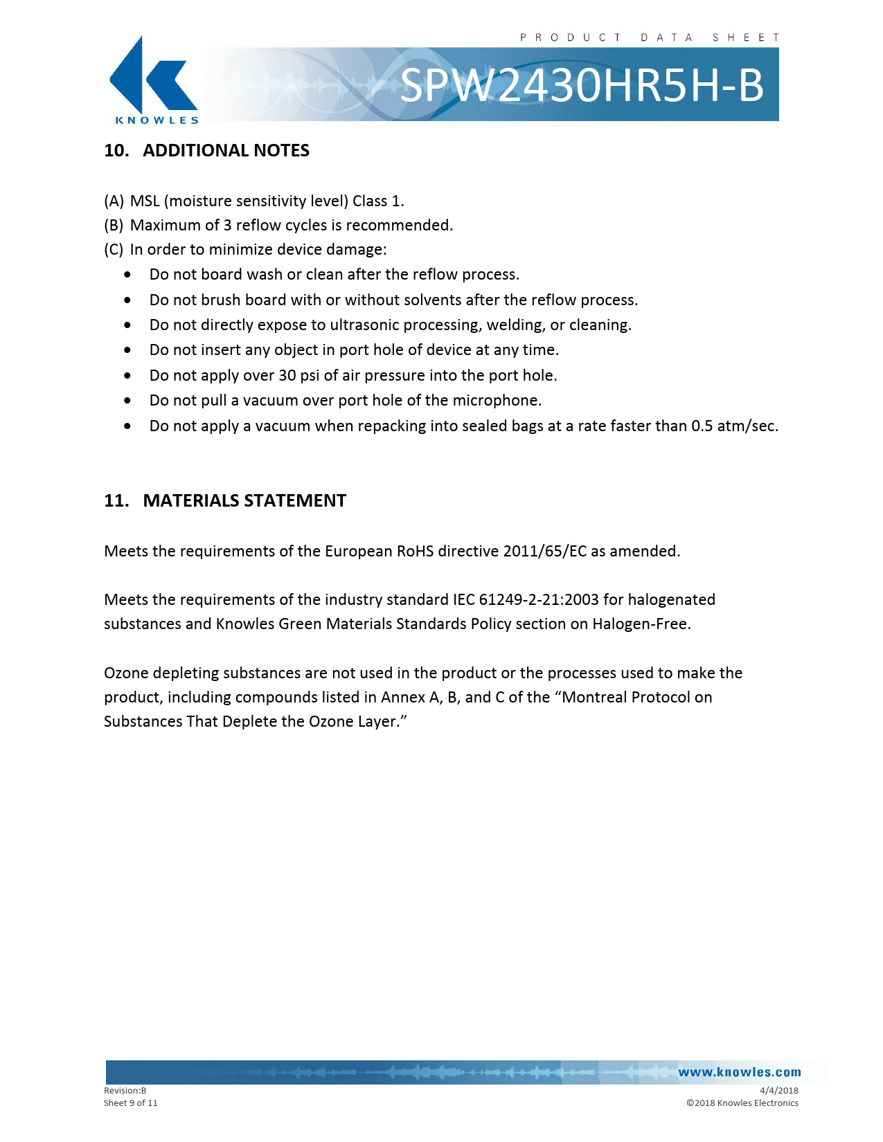 Meets the requirements of the European RoHS directive 2011/65/EC as amended. Meets the requirements of the industry standard IEC 61249-2-21:2003 for halogenated substances and Knowles Green Materials Standards Policy section on Halogen-Free. Ozone depleting substances are not used in the product or the processes used to make the product, including compounds listed in Annex A, B, and C of the “Montreal Protocol on Substances That Deplete the Ozone Layer.” Revision:B 4/4/2018 Sheet 9 of 11 © 2018 Knowles Electronics