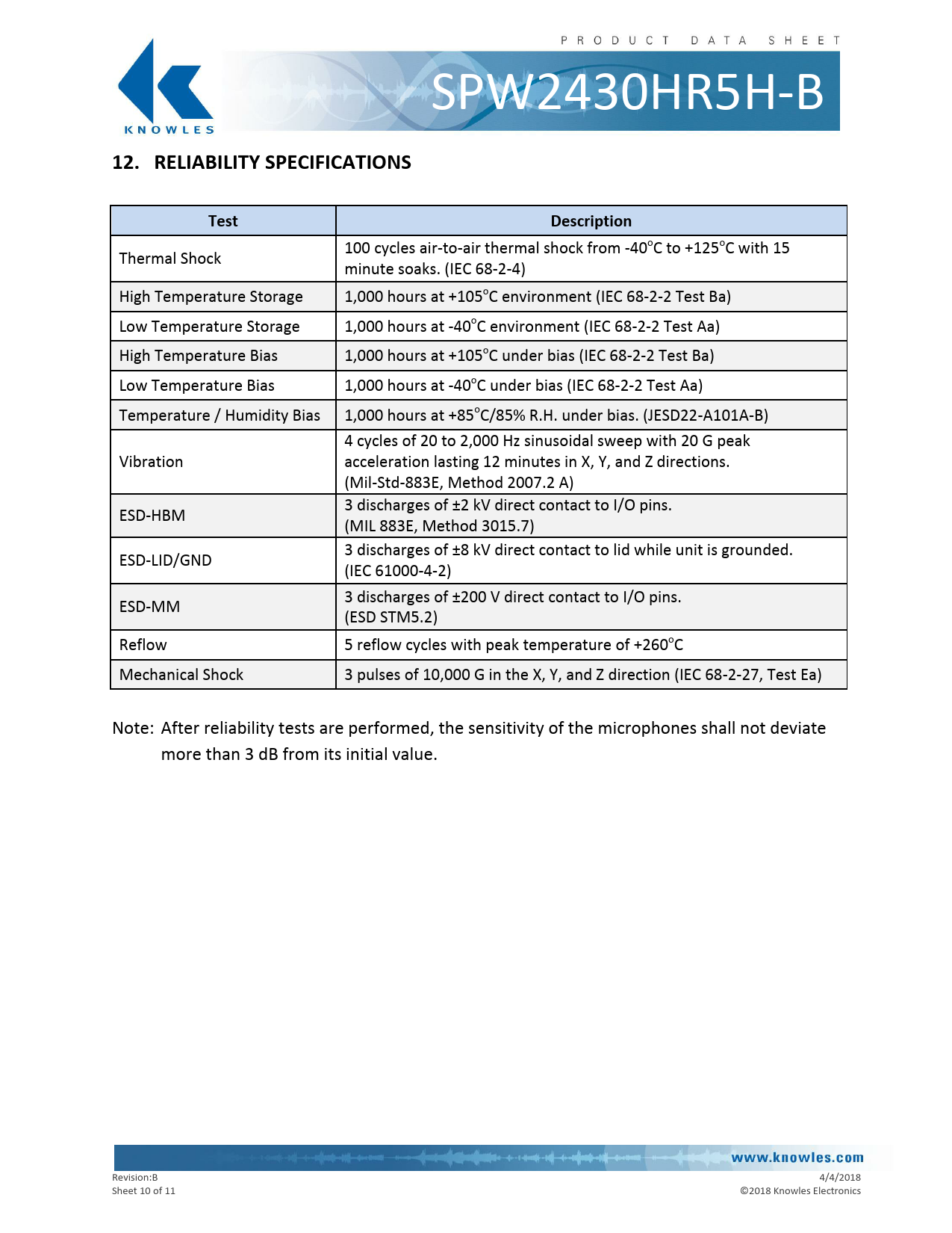 100 cycles air-to-air thermal shock from -40oC to +125oC with 15 Thermal Shock minute soaks. (IEC 68-2-4) High Temperature Storage 1,000 hours at +105oC environment (IEC 68-2-2 Test Ba) Low Temperature Storage 1,000 hours at -40oC environment (IEC 68-2-2 Test Aa) High Temperature Bias 1,000 hours at +105oC under bias (IEC 68-2-2 Test Ba) Low Temperature Bias 1,000 hours at -40oC under bias (IEC 68-2-2 Test Aa) Temperature / Humidity Bias 1,000 hours at +85oC/85% R.H. under bias. (JESD22-A101A-B) 4 cycles of 20 to 2,000 Hz sinusoidal sweep with 20 G peak Vibration acceleration lasting 12 minutes in X, Y, and Z directions. (Mil-Std-883E, Method 2007.2 A) 3 discharges of ±2 kV direct contact to I/O pins. ESD-HBM (MIL 883E, Method 3015.7) 3 discharges of ±8 kV direct contact to lid while unit is grounded. ESD-LID/GND (IEC 61000-4-2) 3 discharges of ±200 V direct contact to I/O pins. ESD-MM (ESD STM5.2) Reflow 5 reflow cycles with peak temperature of +260oC Mechanical Shock 3 pulses of 10,000 G in the X, Y, and Z direction (IEC 68-2-27, Test Ea) Note: After reliability tests are performed, the sensitivity of the microphones shall not deviate more than 3 dB from its initial value. Revision:B 4/4/2018 Sheet 10 of 11 © 2018 Knowles Electronics