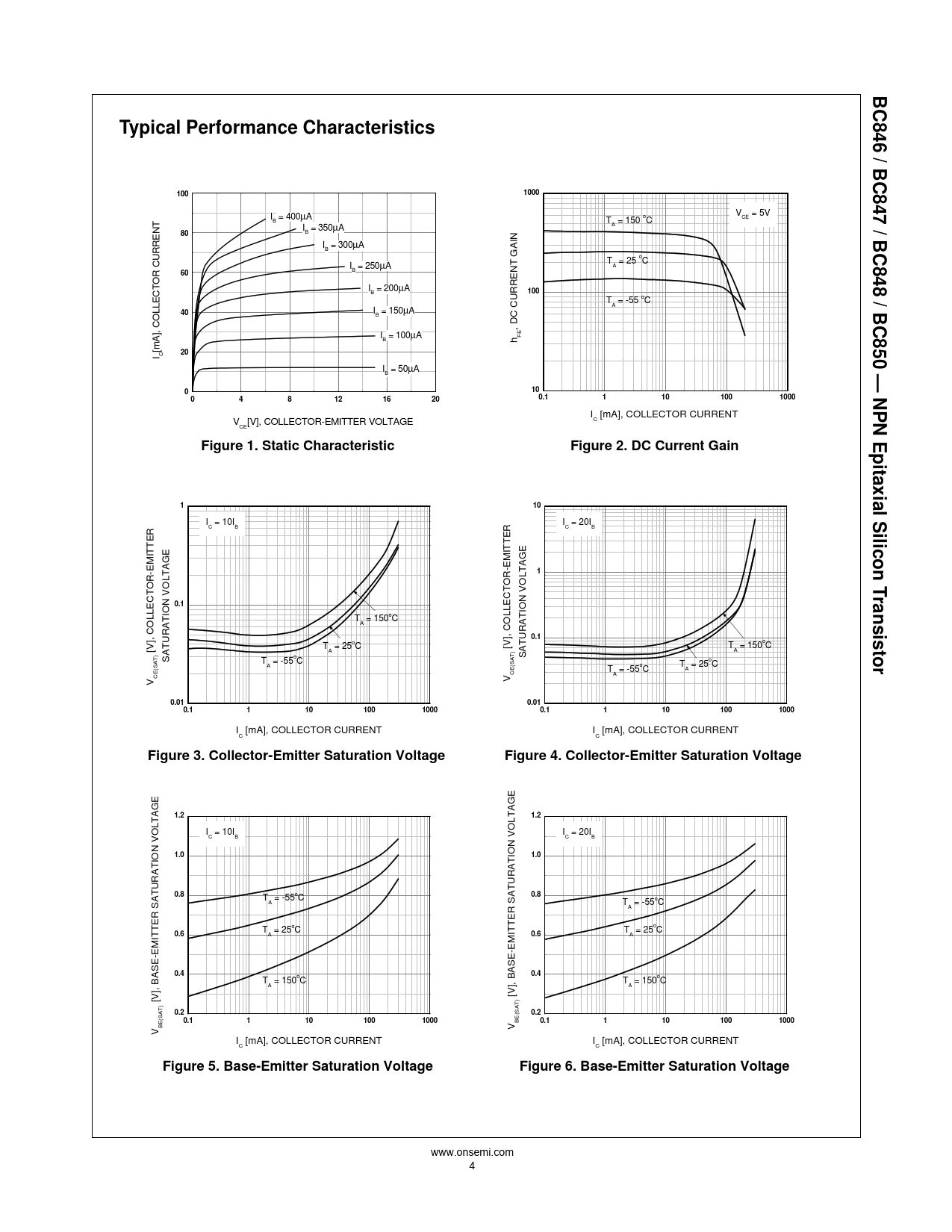 BC846 / BC847 / BC848 / BC850 —Typical Performance Characteristics1001000 I = 400μA V = 5V CE B T = 150 oC I = 350μA A 80 B IN I = 300μA A B G T = 25 oC I = 250μA T A N 60 B R CURRENT O I = 200μA B 100 CURRE T = -55 oC A 40 I = 150μA B , COLLECT , DC I = 100μA A] B h FE [m 20 I C I = 50μA B 0100.11101001000NPN048121620 I [mA], COLLECTOR CURRENT V [V], COLLECTOR-EMITTER VOLTAGE C CE EpitFigure 1. Static CharacteristicFigure 2. DC Current Gainaxia110l Silicon T I = 10I I = 20I C B C B R R E E T T E IT M MIT AG E AGE -E T 1 R- LT R O O VO CT VOL r CT N 0.1ansistor E L ON LLE IO T = 150oC A ATI AT R COL R ], ], CO U 0.1 T = 25oC V T = 150oC [V A [ A ) SATU T SAT T = -55oC A A (S T = 25oC (SAT T = -55oC A E CE A C V V 0.010.010.111010010000.11101001000 I [mA], COLLECTOR CURRENT I [mA], COLLECTOR CURRENT C C Figure 3. Collector-Emitter Saturation VoltageFigure 4. Collector-Emitter Saturation Voltage E AGE AG 1.2 T 1.2 LT I = 10I I = 20I C B C B VO VOL N ON 1.01.0 IO ATI AT R R U 0.8 T = -55oC 0.8 A SATU T = -55oC SAT A ER TER T T = 25oC T T = 25oC 0.6 IT A 0.6 A EMI 0.40.4 T = 150oC , BASE-EM T = 150oC A , BASE- A [V] [V] ) AT 0.2 S 0.2 (SAT 0.11101001000 BE( 0.11101001000 BE V V I [mA], COLLECTOR CURRENT I [mA], COLLECTOR CURRENT C C Figure 5. Base-Emitter Saturation VoltageFigure 6. Base-Emitter Saturation Voltage www.onsemi.com 4