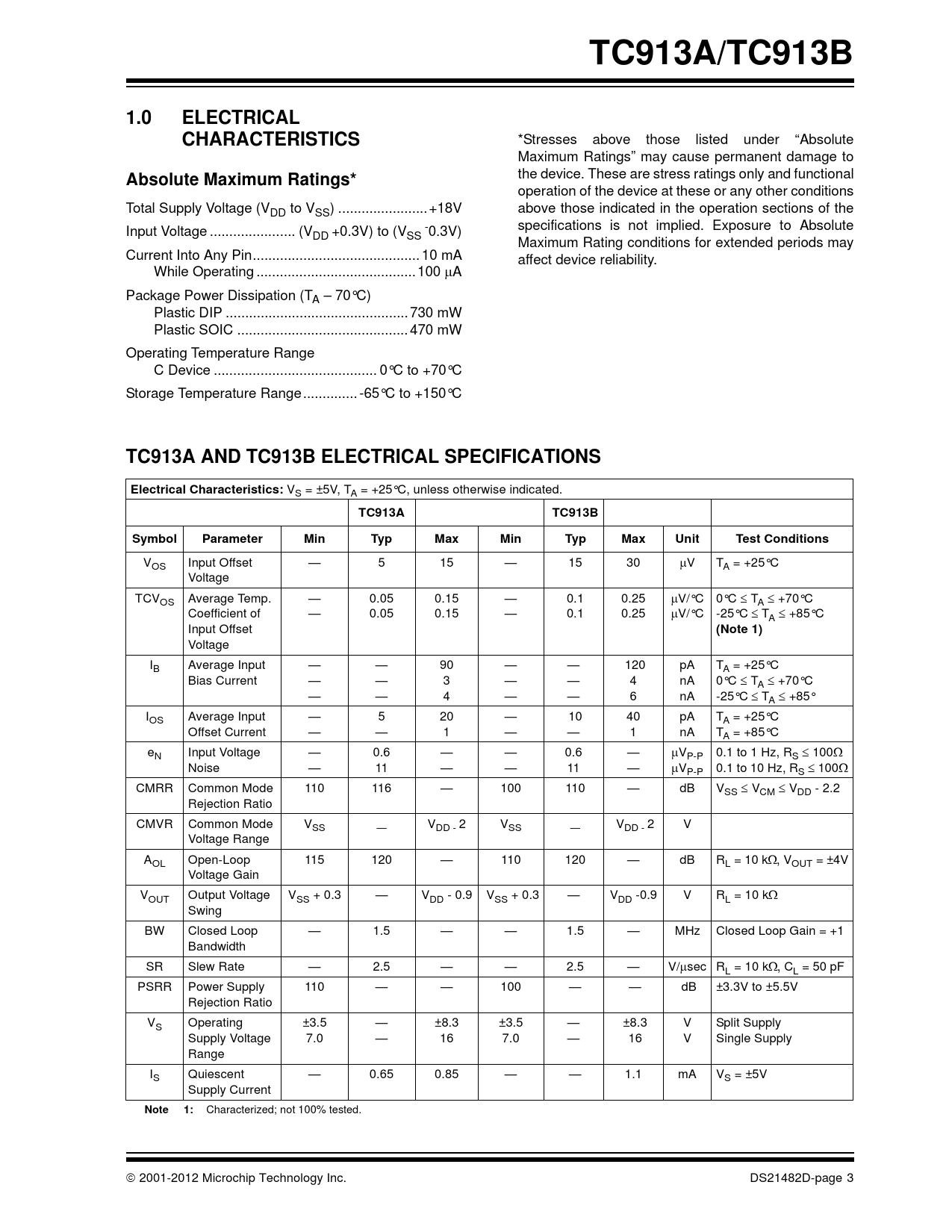 TC913A/TC913B1.0ELECTRICAL CHARACTERISTICS *Stresses above those listed under “Absolute Maximum Ratings” may cause permanent damage to Absolute Maximum Ratings* the device. These are stress ratings only and functional operation of the device at these or any other conditions Total Supply Voltage (VDD to VSS) ...+18V above those indicated in the operation sections of the Input Voltage .. (V - specifications is not implied. Exposure to Absolute DD +0.3V) to (VSS 0.3V) Maximum Rating conditions for extended periods may Current Into Any Pin... 10 mA affect device reliability. While Operating ... 100 A Package Power Dissipation (TA – 70°C) Plastic DIP ... 730 mW Plastic SOIC .. 470 mW Operating Temperature Range C Device .. 0°C to +70°C Storage Temperature Range .. -65°C to +150°C TC913A AND TC913B ELECTRICAL SPECIFICATIONSElectrical Characteristics: VS = ±5V, TA = +25°C, unless otherwise indicated. TC913ATC913BSymbolParameterMinTypMaxMinTypMaxUnitTest Conditions VOS Input Offset — 5 15 — 15 30 V TA = +25°C Voltage TCV OS Average Temp. — 0.05 0.15 — 0.1 0.25 V/°C 0°C TA +70°C Coefficient of — 0.05 0.15 — 0.1 0.25 V/°C -25°C TA +85°C Input Offset (Note 1) Voltage IB Average Input — — 90 — — 120 pA TA = +25°C Bias Current — — 3 — — 4 nA 0°C TA +70°C — — 4 — — 6 nA -25°C TA +85° IOS Average Input — 5 20 — 10 40 pA TA = +25°C Offset Current — — 1 — — 1 nA TA = +85°C e N Input Voltage — 0.6 — — 0.6 — VP-P 0.1 to 1 Hz, RS 100 Noise — 11 — — 11 — VP-P 0.1 to 10 Hz, RS 100 CMRR Common Mode 110 116 — 100 110 — dB VSS VCM VDD - 2.2 Rejection Ratio CMVR Common Mode VSS — VDD - 2 VSS — VDD - 2 V Voltage Range AOL Open-Loop 115 120 — 110 120 — dB RL = 10 k, VOUT = ±4V Voltage Gain VOUT Output Voltage VSS + 0.3 — VDD - 0.9 VSS + 0.3 — VDD -0.9 V RL = 10 k Swing BW Closed Loop — 1.5 — — 1.5 — MHz Closed Loop Gain = +1 Bandwidth SR Slew Rate — 2.5 — — 2.5 — V/sec RL = 10 k, CL = 50 pF PSRR Power Supply 110 — — 100 — — dB ±3.3V to ±5.5V Rejection Ratio VS Operating ±3.5 — ±8.3 ±3.5 — ±8.3 V Split Supply Supply Voltage 7.0 — 16 7.0 — 16 V Single Supply Range IS Quiescent — 0.65 0.85 — — 1.1 mA VS = ±5V Supply Current Note1: Characterized; not 100% tested. 2001-2012 Microchip Technology Inc. DS21482D-page 3 Document Outline TC913A/TC913B Features: Applications: Device Selection Table Package Type General Description: Functional Block Diagram 1.0 Electrical characteristics Absolute Maximum Ratings* tc913a and tc913b electrical specifications Note 1: Characterized; not 100% tested. 2.0 Pin Descriptions TABLE 2-1: Pin Function Table 3.0 Detailed Description 3.1 Theory of Operation 3.2 Pin Compatibility 3.3 Overload Recovery 3.4 Avoiding Latch-up 4.0 Typical Characteristics 5.0 packaging information 5.1 Package Marking Information 5.2 Taping Form 5.3 Package Dimensions 6.0 Revision History Notes: Dual Auto-Zeroed Operational Amplifiers The Microchip Web Site Customer Change Notification Service Customer Support Reader Response Corporate Office Atlanta Boston Chicago Cleveland Fax: 216-447-0643 Dallas Detroit Indianapolis Toronto Fax: 852-2401-3431 Australia - Sydney China - Beijing China - Shanghai India - Bangalore Korea - Daegu Korea - Seoul Singapore Taiwan - Taipei Fax: 43-7242-2244-393 Denmark - Copenhagen France - Paris Germany - Munich Italy - Milan Spain - Madrid UK - Wokingham Worldwide Sales and Service
