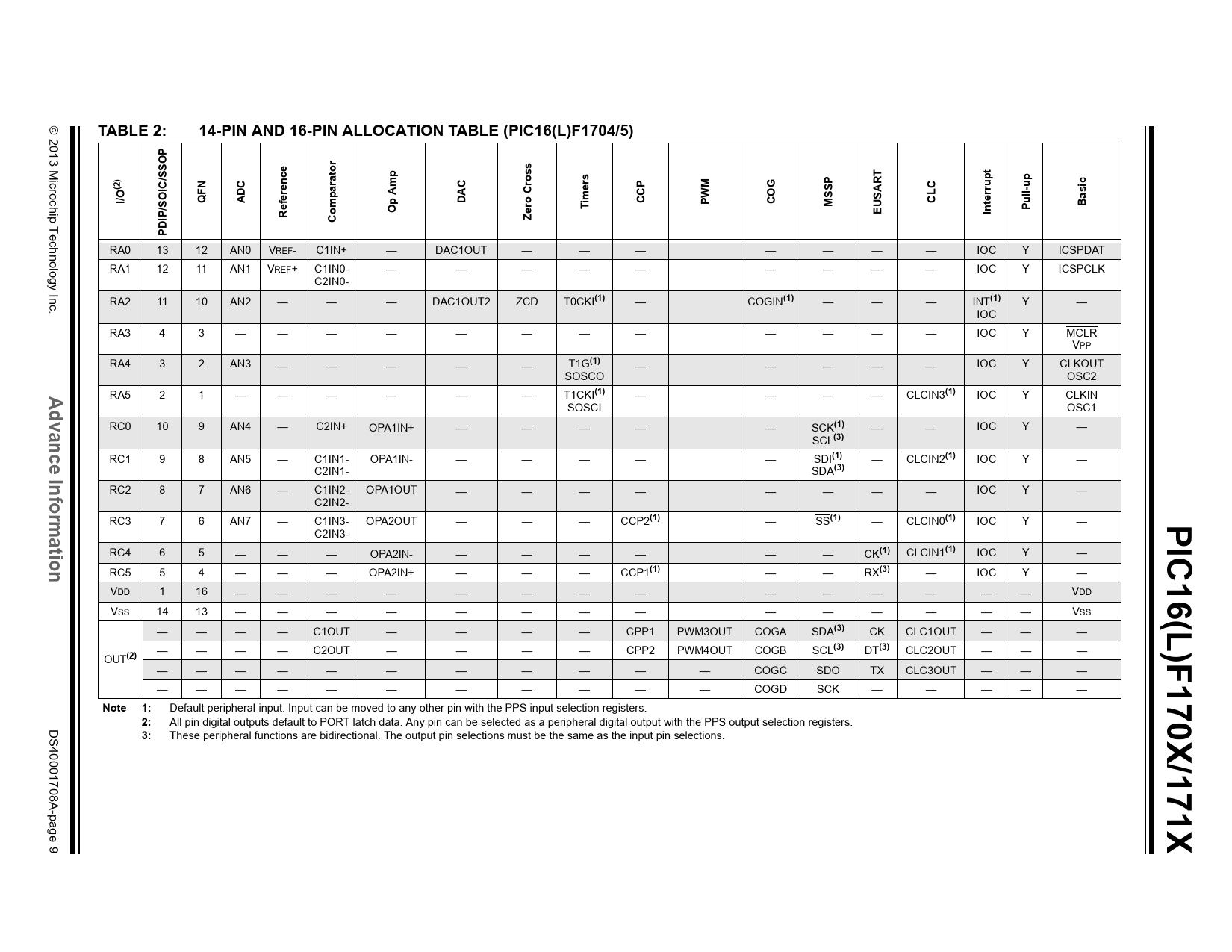 TABLE 2:. 14-PIN AND 16-PIN ALLOCATION TABLE (PIC16(L)F1704/5). O S. ros. SSP. rru. ll-u. sic. I/O. OIC/S. ADC. feren. DAC. PWM. COG. EUSART. (1). A d