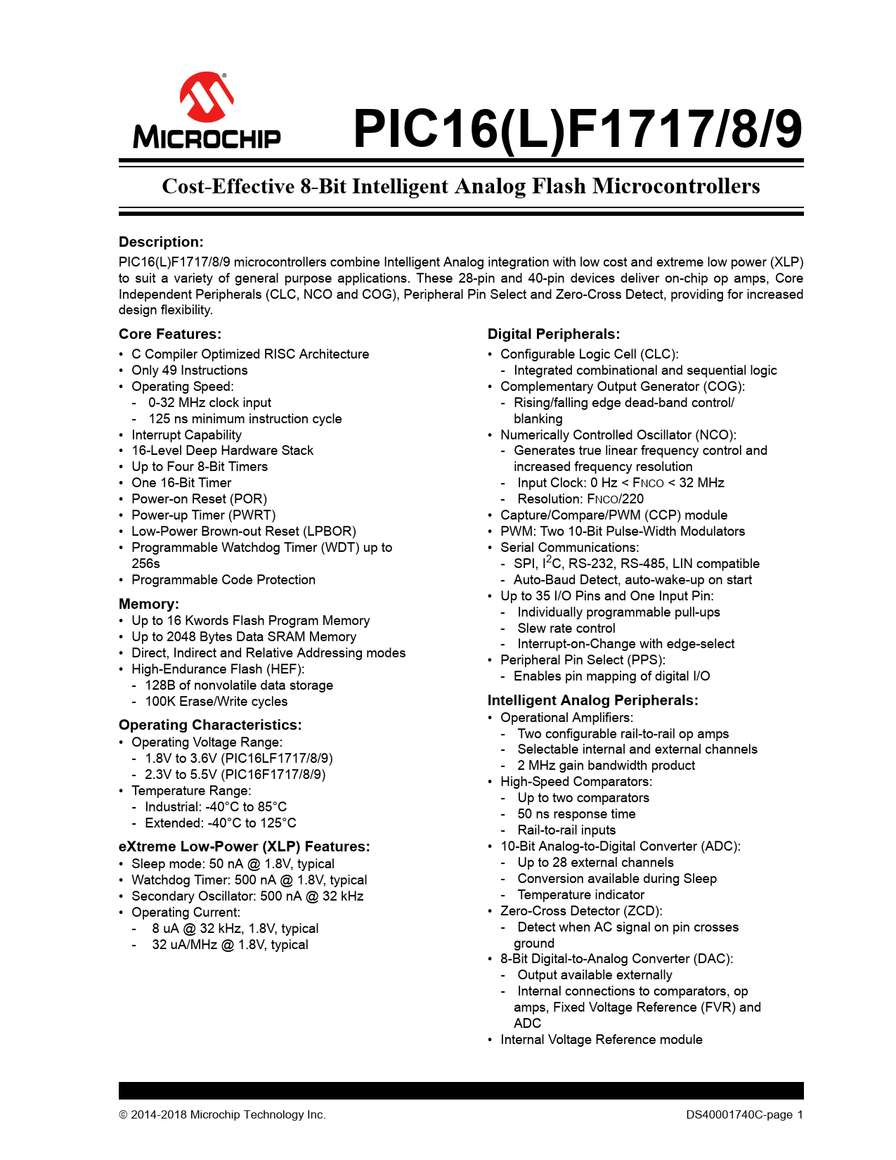 PIC16(L)F1717/8/9. Cost-Effective 8-Bit Intelligent Analog Flash Microcontrollers. Description:. Core Features: