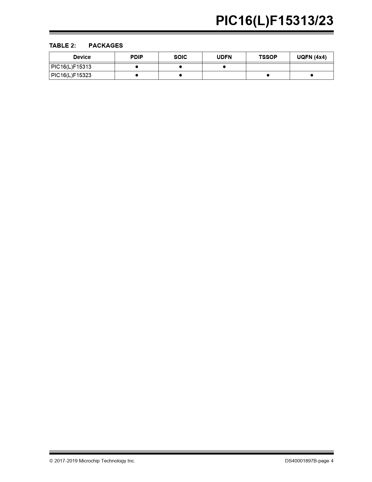 PIC16(L)F15313/23. TABLE 2:. PACKAGES. Device. PDIP. SOIC. UDFN. TSSOP. UQFN (4x4)