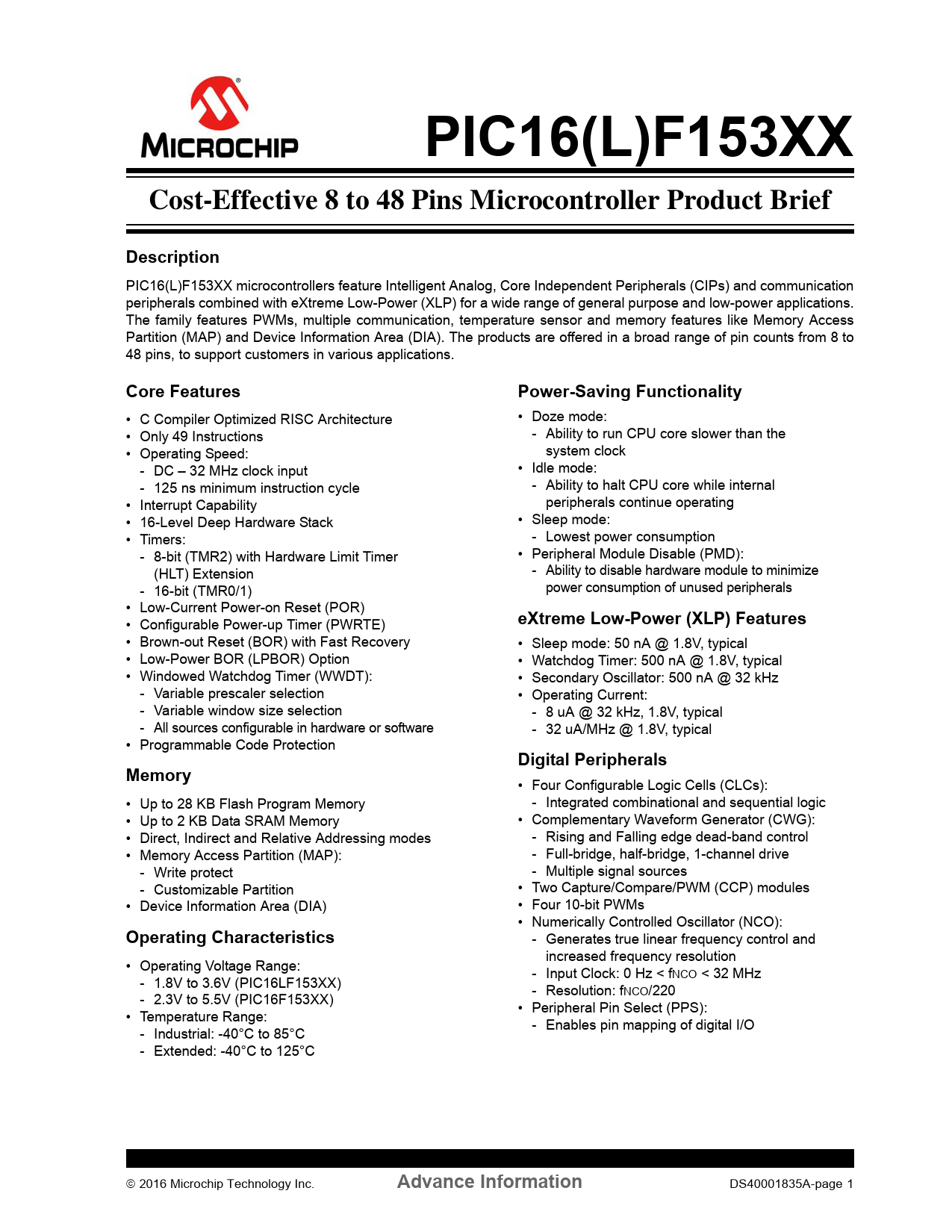 | 页数 / 页 | 24 / 1 — PIC16(L)F153XX. Cost-Effective 8 to 48 Pins Microcontroller Product … |