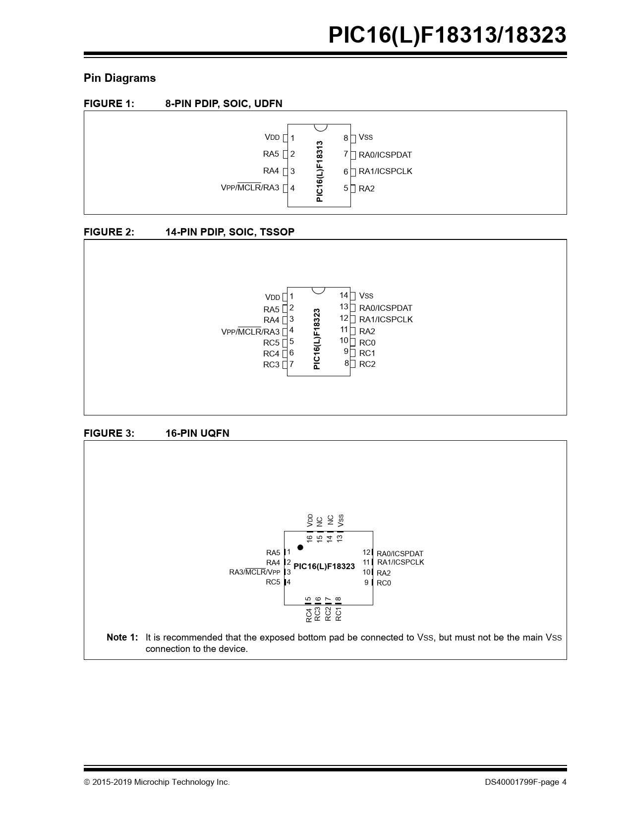 PIC16(L)F18313/18323. Pin Diagrams. FIGURE 1:. 8-PIN PDIP, SOIC, UDFN. 18313. L)F. PIC16(. FIGURE 2:. 14-PIN PDIP, SOIC, TSSOP. F18323