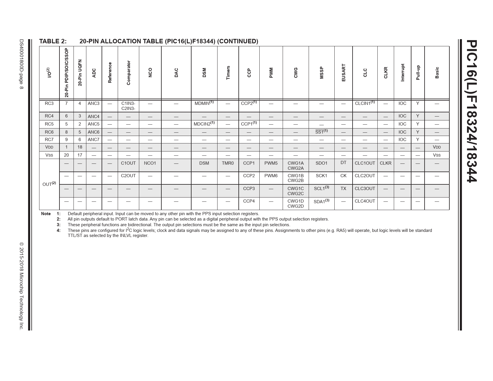 PIC16(L)F18324/18344. TABLE 2:. 20-PIN ALLOCATION TABLE (PIC16(L)F18344) (CONTINUED). (2). I/O. ADC. NCO. DAC. DSM. imers. CCP. CLC. PWM. CWG. MSSP