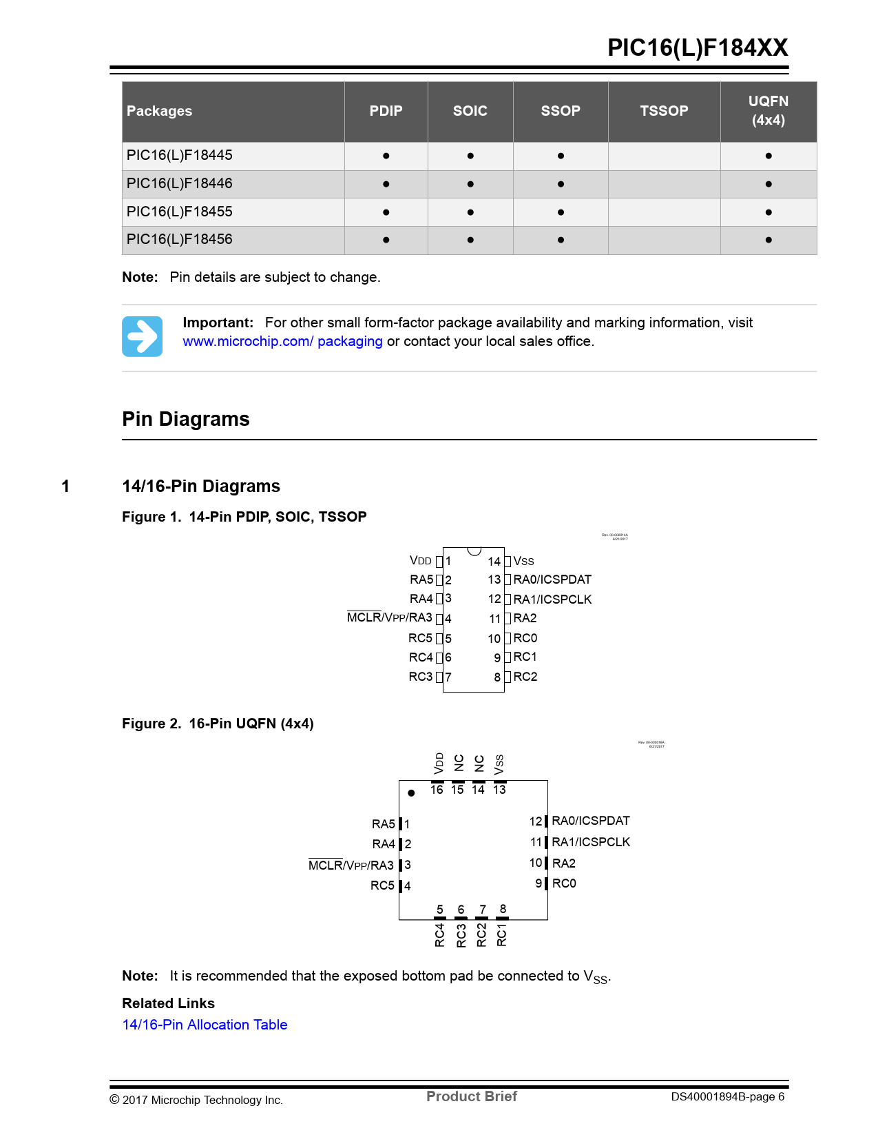 | 页数 / 页 | 18 / 6 — PIC16(L)F184XX. UQFN. Packages. PDIP. SOIC. SSOP. TSSOP. (4x4). Note: . … |