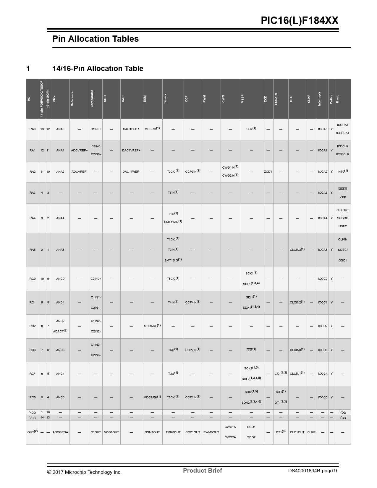 | 页数 / 页 | 18 / 9 — PIC16(L)F184XX. Pin Allocation Tables. 14/16-Pin Allocation Table. I/O. … |