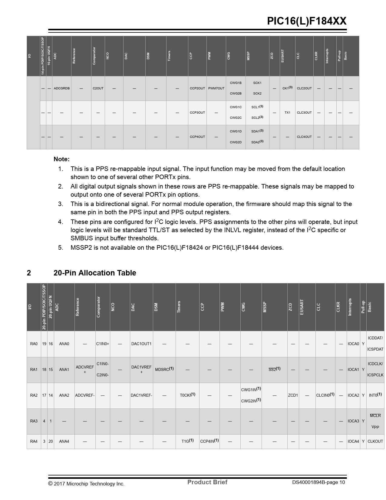 2 20-Pin Allocation Table I/O ADC NCO DAC DSM imers CCP CLC T PWM CWG MSSP ZCD CLKR Pull-up Basic Reference EUSART Interrupts 20-pin UQFN Comparator 20-pin PDIP/SOIC/TSSOP